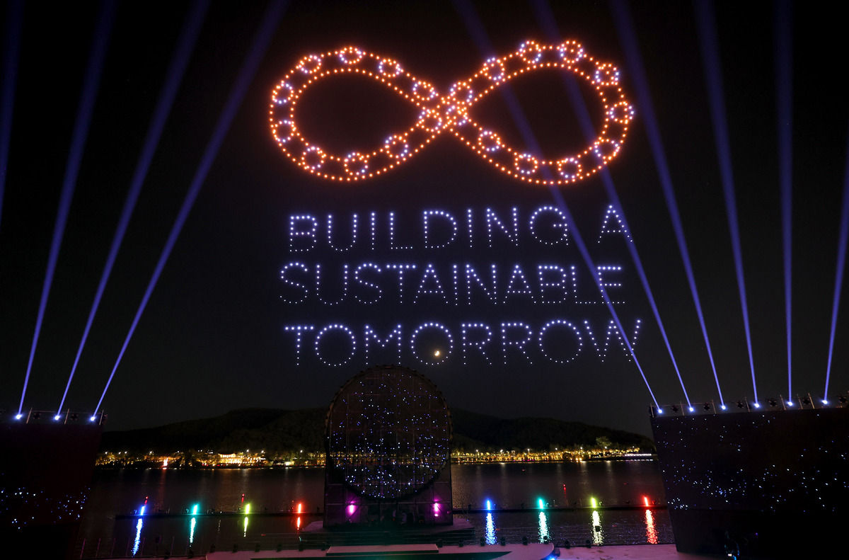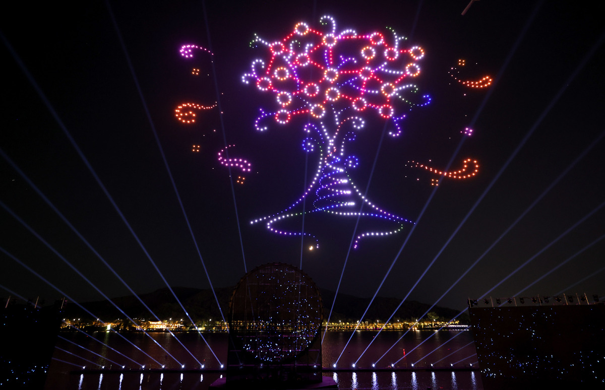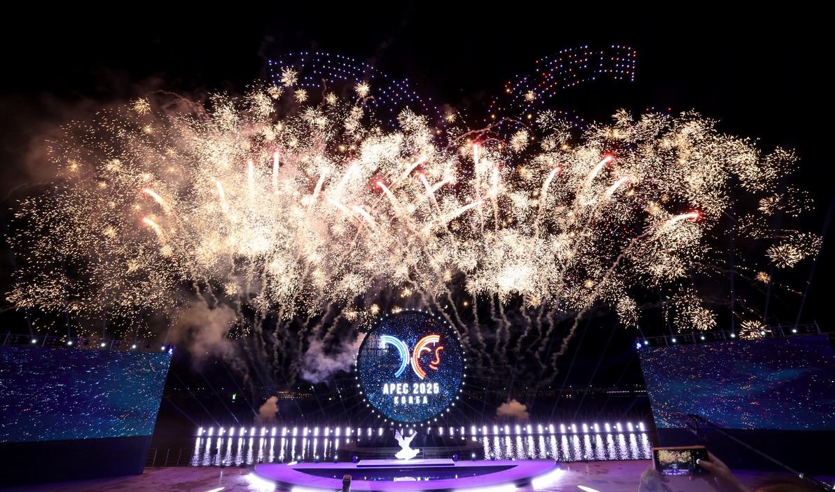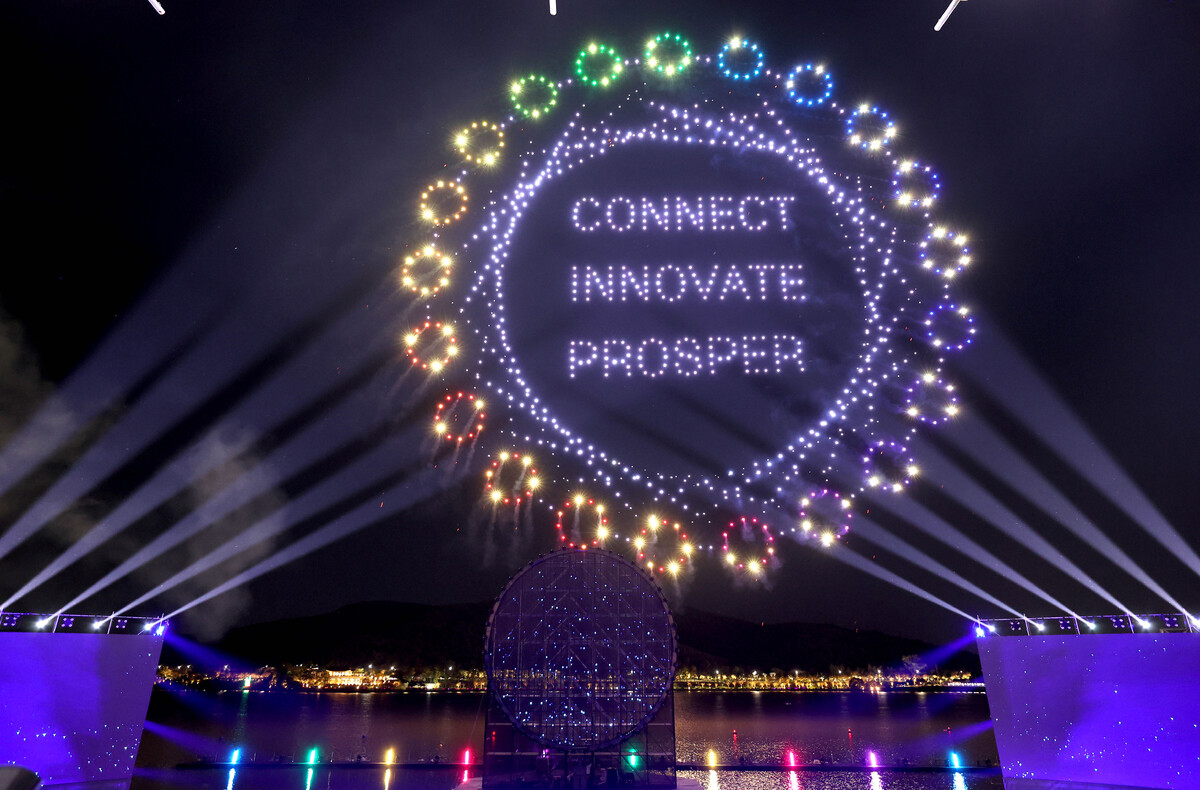 APEC 정상회의 기념 멀티미디어 쇼가 27일 오후 경주 보문 관광단지 수상 공연장에서 ‘달빛 아래 새로운 약속’을 주제로 열렸다. 레이저 쇼와 불꽃, 드론 쇼 등 화려한 빛의 향연이 보문호 밤하늘을 수놓고 있다. /이용선기자 photokid@kbmaeil.com