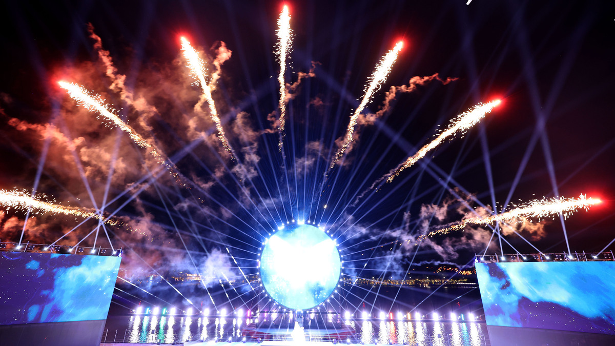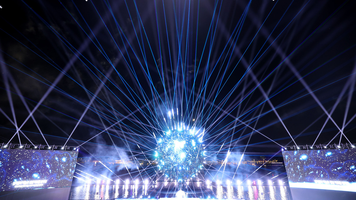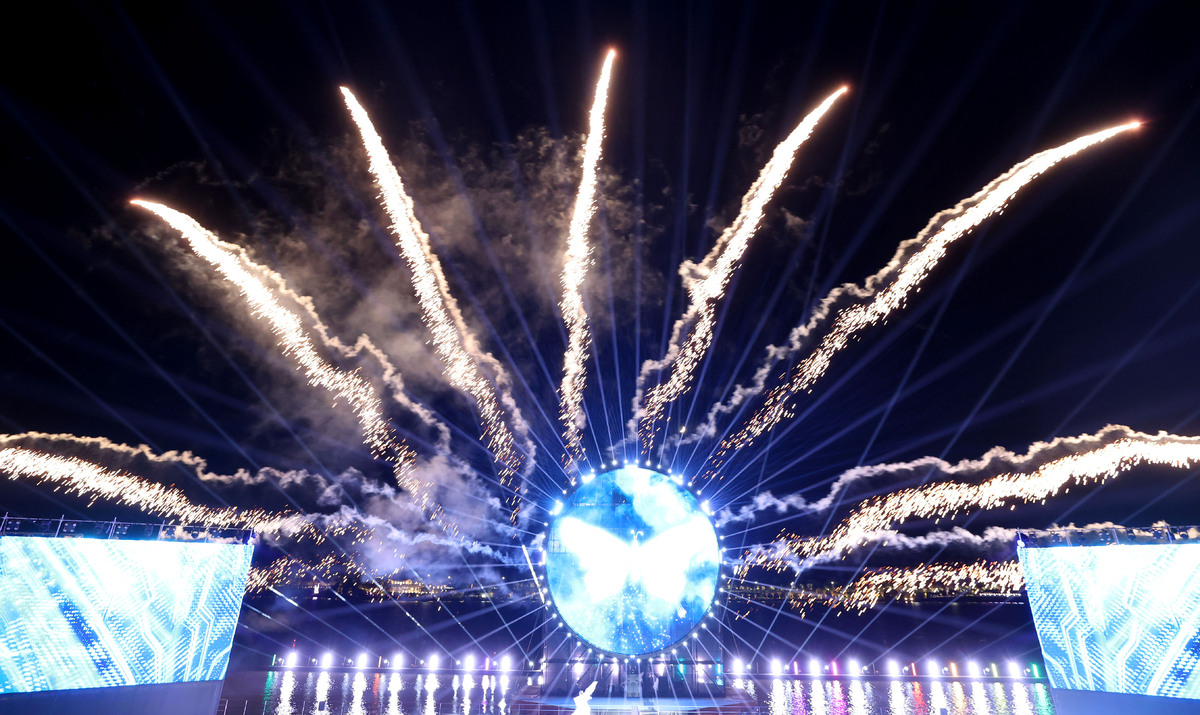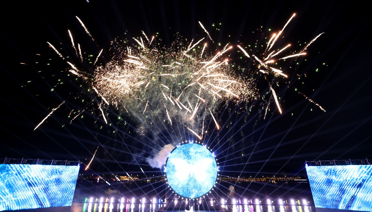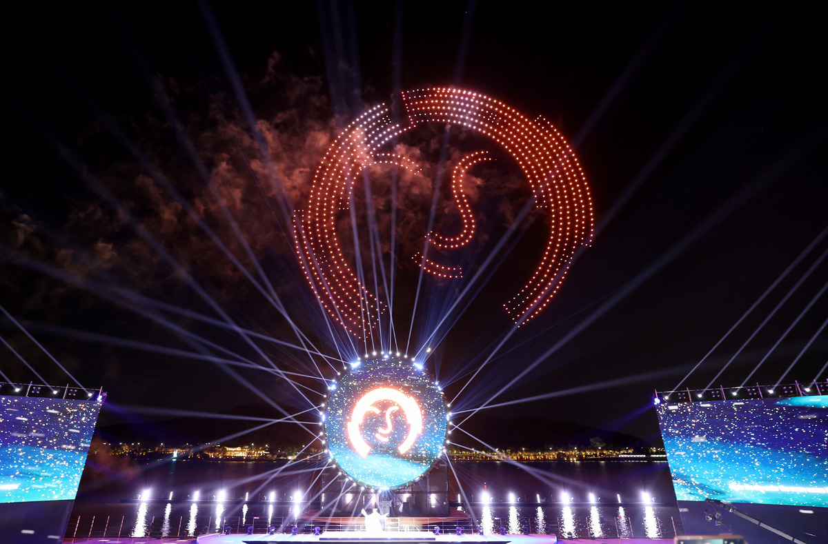 APEC 정상회의 기념 멀티미디어 쇼가 27일 오후 경주 보문 관광단지 수상 공연장에서 ‘달빛 아래 새로운 약속’을 주제로 열렸다. 레이저 쇼와 불꽃, 드론 쇼 등 화려한 빛의 향연이 보문호 밤하늘을 수놓고 있다. /이용선기자 photokid@kbmaeil.com