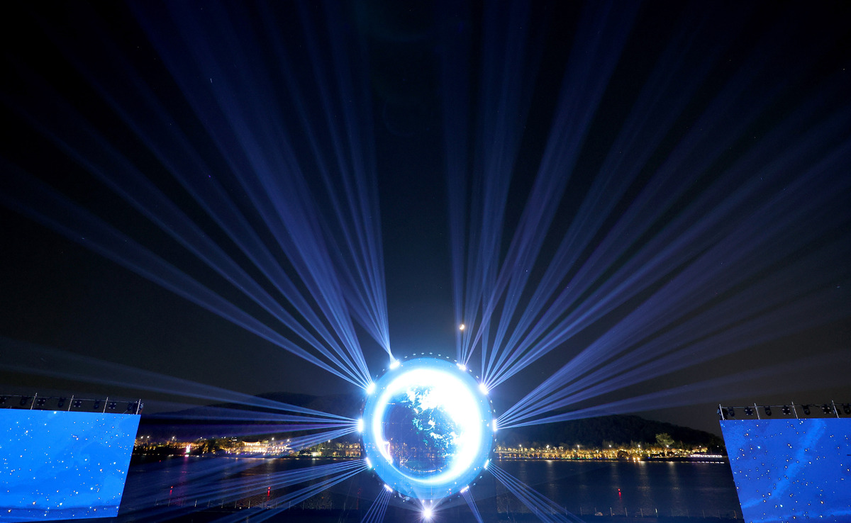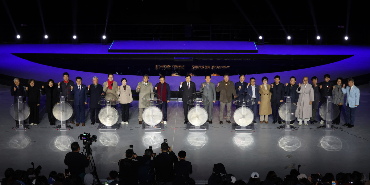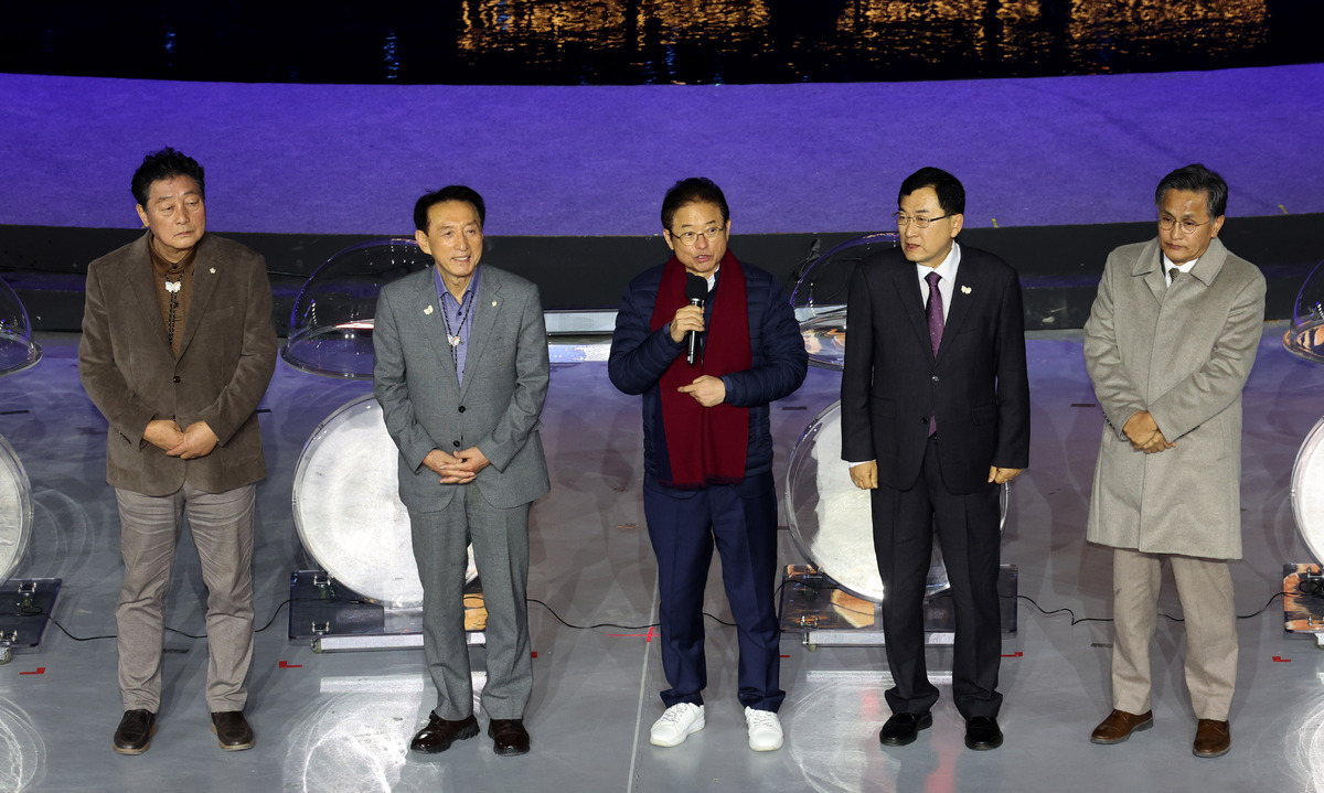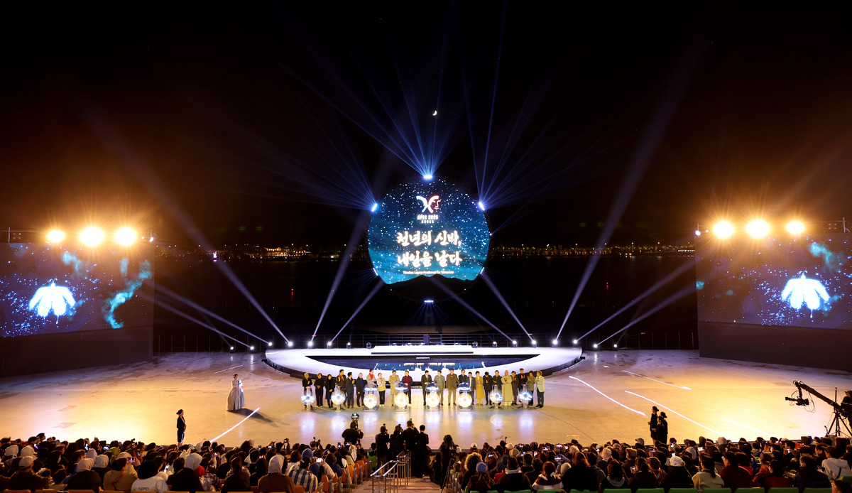 APEC 정상회의 기념 멀티미디어 쇼가 27일 오후 경주 보문 관광단지 수상 공연장에서 ‘달빛 아래 새로운 약속’을 주제로 열렸다. 이철우 도지사, 박성만 도의회 의장, 주낙영 경주시장, 이동협 경주시의회 의장, 김석기 국회의원, 최윤채 경북매일신문 사장을 비롯한 내빈들이 화합을 다짐하는 홀로그램 터치 세리머니를 하고 있다. /이용선기자 photokid@kbmaeil.com