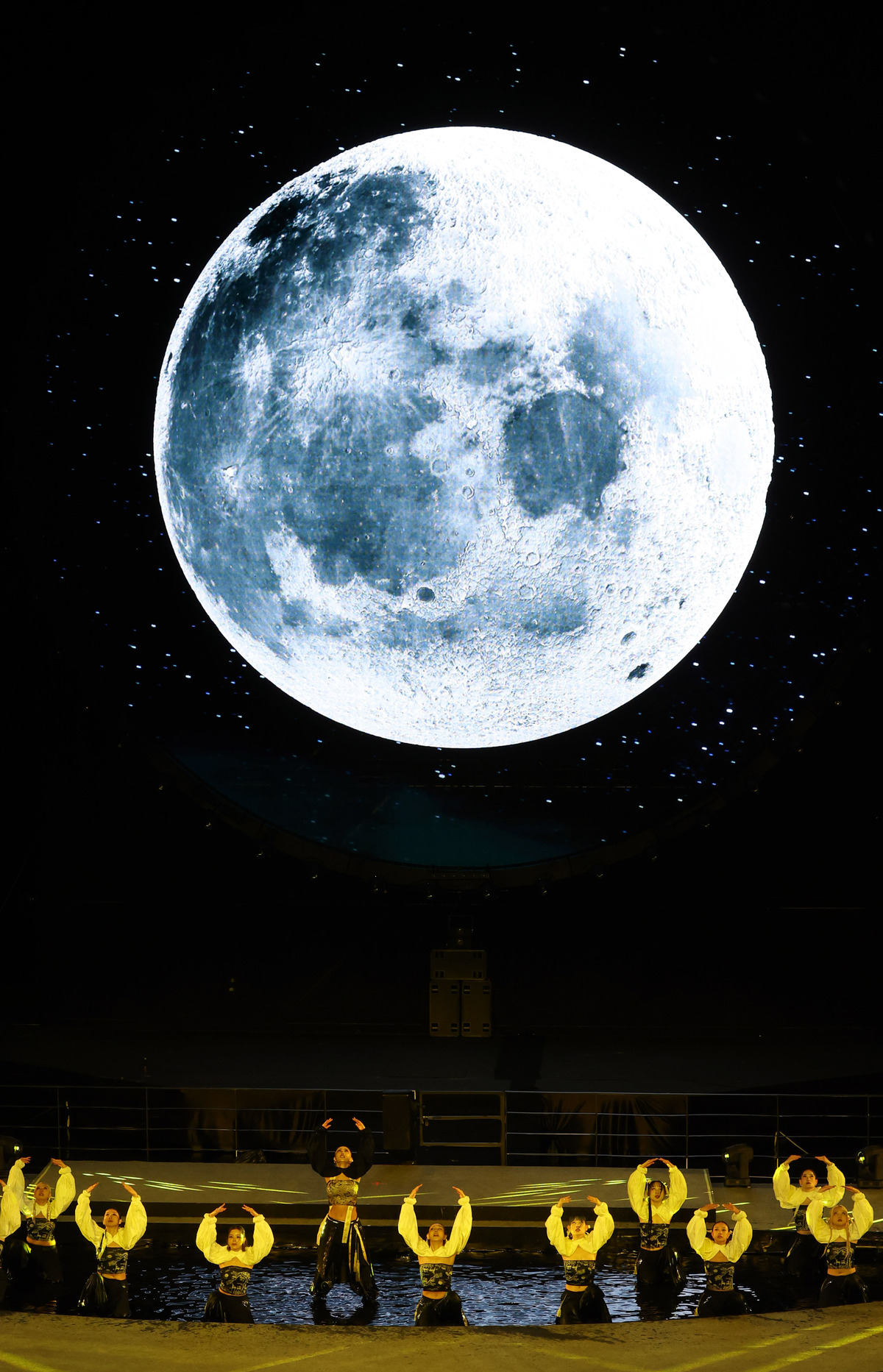 APEC 정상회의 기념 멀티미디어 쇼가 27일 오후 경주 보문 관광단지 수상 공연장에서 ‘달빛 아래 새로운 약속’을 주제로 열렸다. 화려한 빛의 향연이 보문호 밤하늘을 수놓고 있다. /이용선기자 photokid@kbmaeil.com