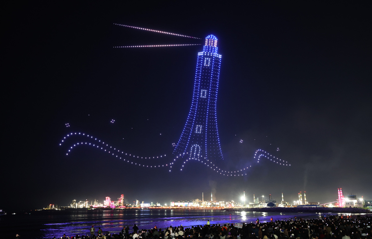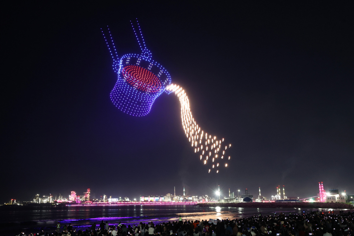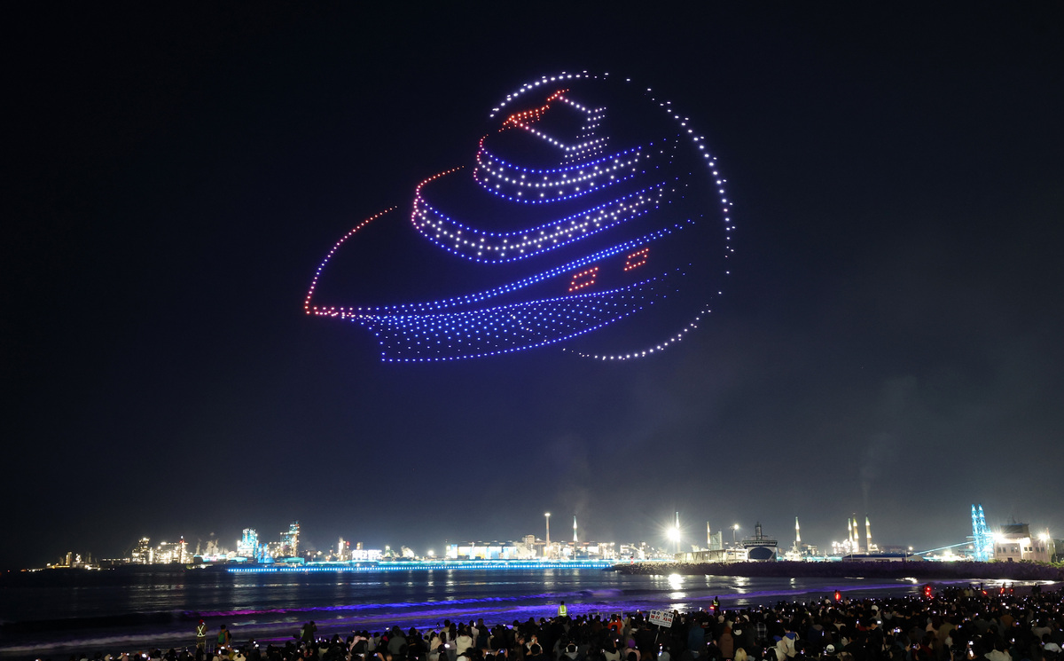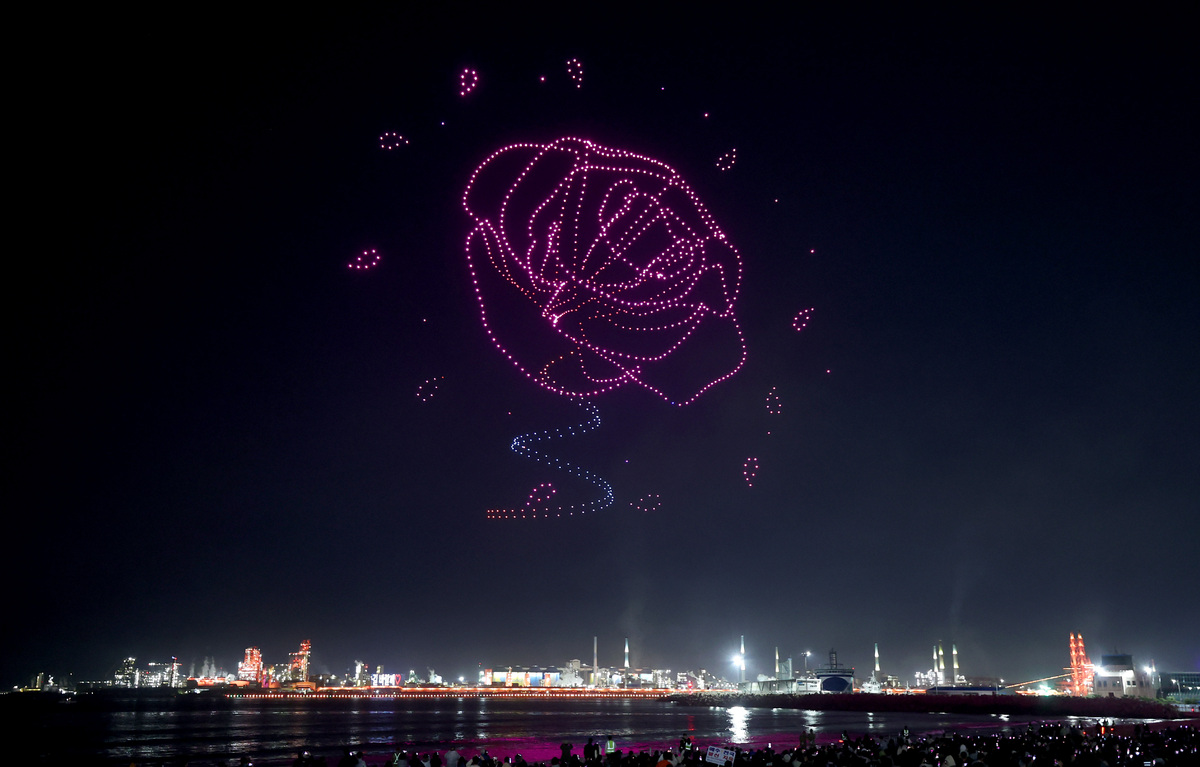 APEC 정상회의 기념 포항 불꽃 & 드론 쇼가 29일 오후 영일대 해수욕장에서 열렸다. 수천 대의 드론이 APEC 정상회의 성공 개최를 기원하는 쇼를 펼치고 있다. /이용선기자 photokid@kbmaeil.com