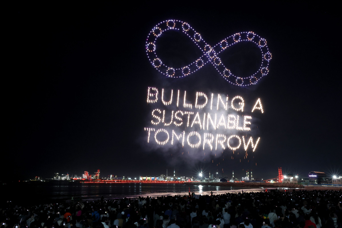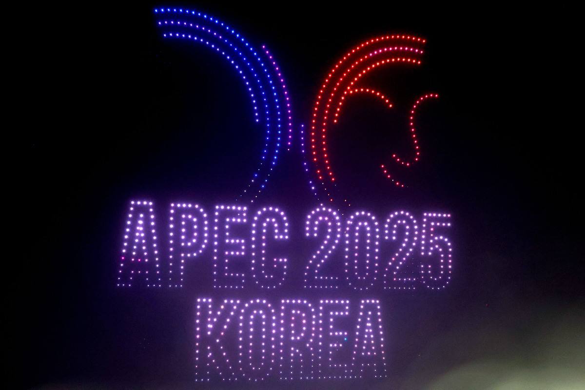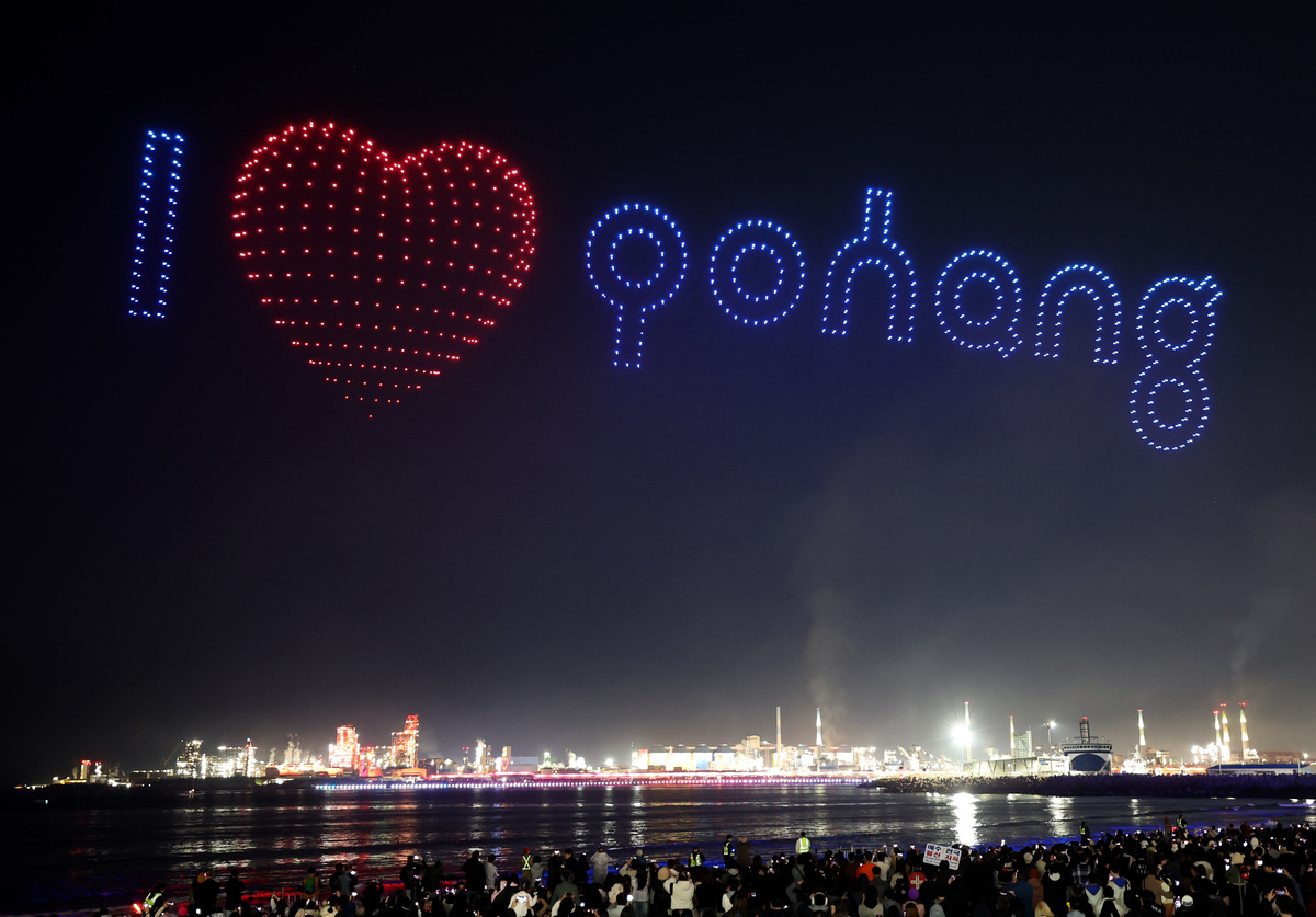 APEC 정상회의 기념 포항 불꽃 & 드론 쇼가 29일 오후 영일대 해수욕장에서 열렸다. 수천 대의 드론이 APEC 정상회의 성공 개최를 기원하는 쇼를 펼치고 있다. /이용선기자 photokid@kbmaeil.com