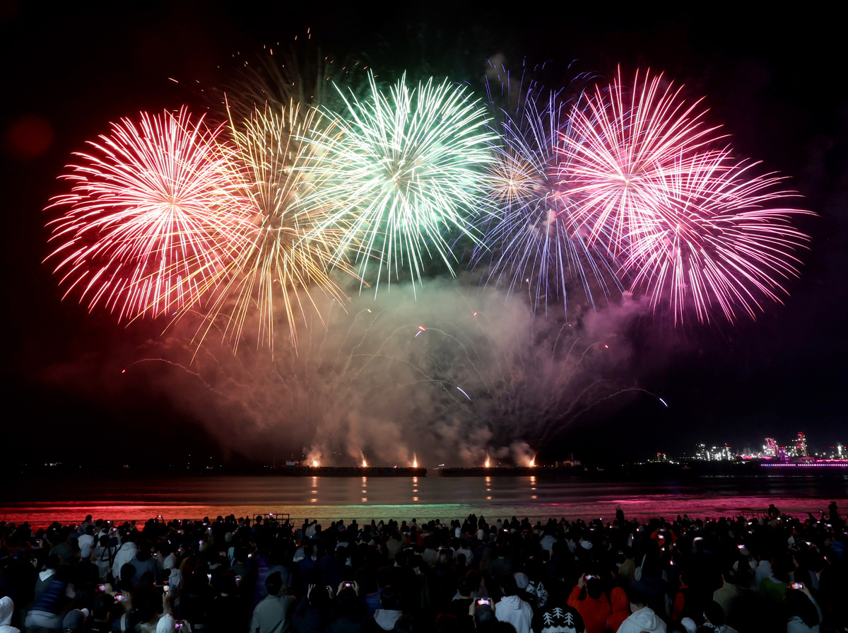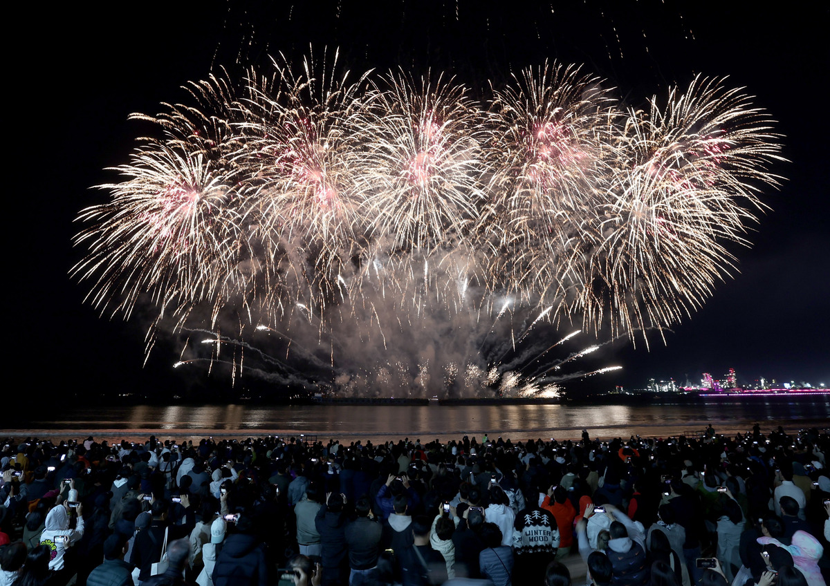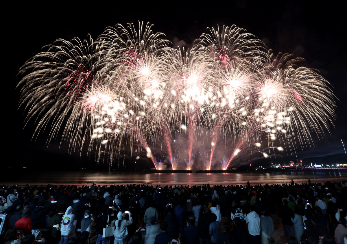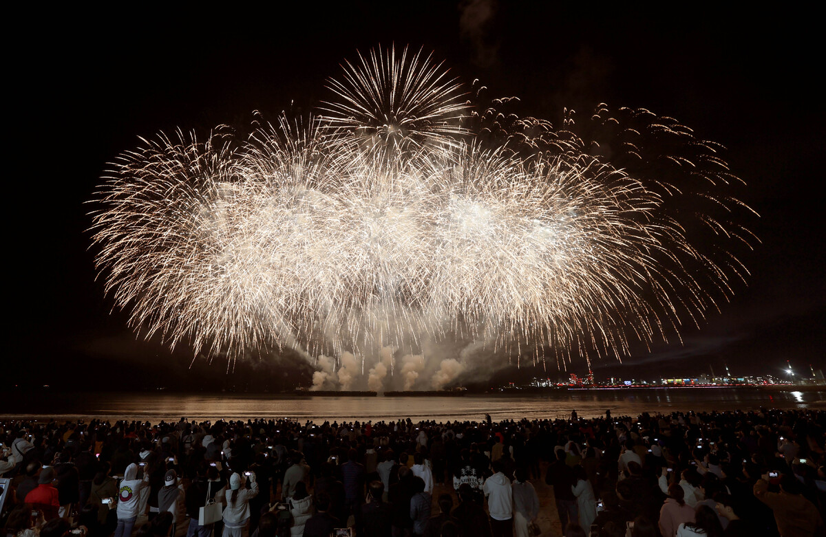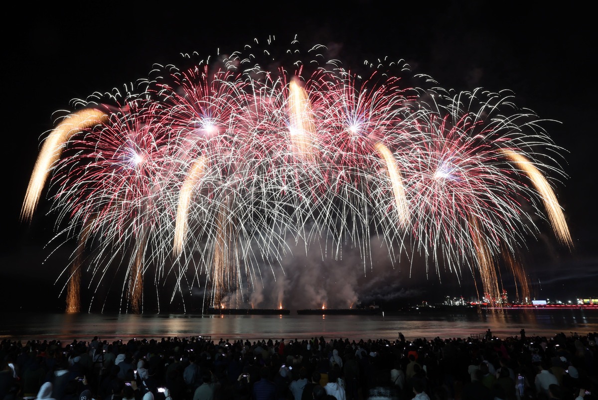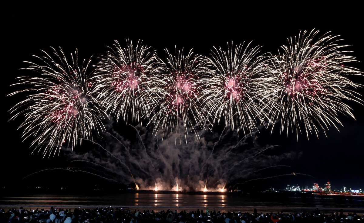 APEC 정상회의 기념 포항 불꽃 & 드론 쇼가 29일 오후 영일대 해수욕장에서 열렸다. 1만 5,000여 발의 화려한 불꽃이 영일만 밤하늘을 아름답게 수놓고 있다. /이용선기자 photokid@kbmaeil.com