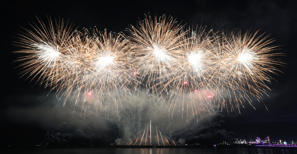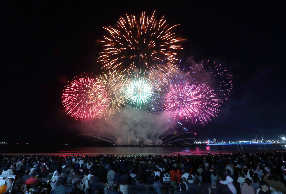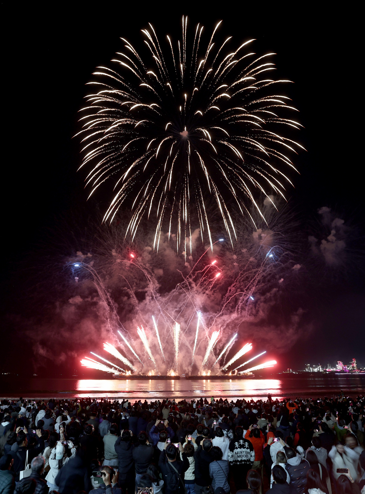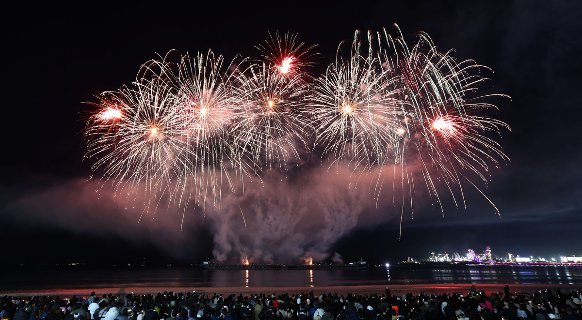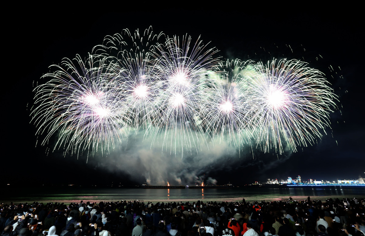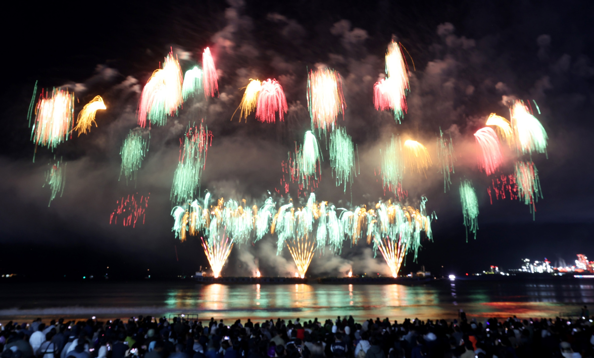 APEC 정상회의 기념 포항 불꽃 & 드론 쇼가 29일 오후 영일대 해수욕장에서 열렸다. 1만 5,000여 발의 화려한 불꽃이 영일만 밤하늘을 아름답게 수놓고 있다. /이용선기자 photokid@kbmaeil.com
