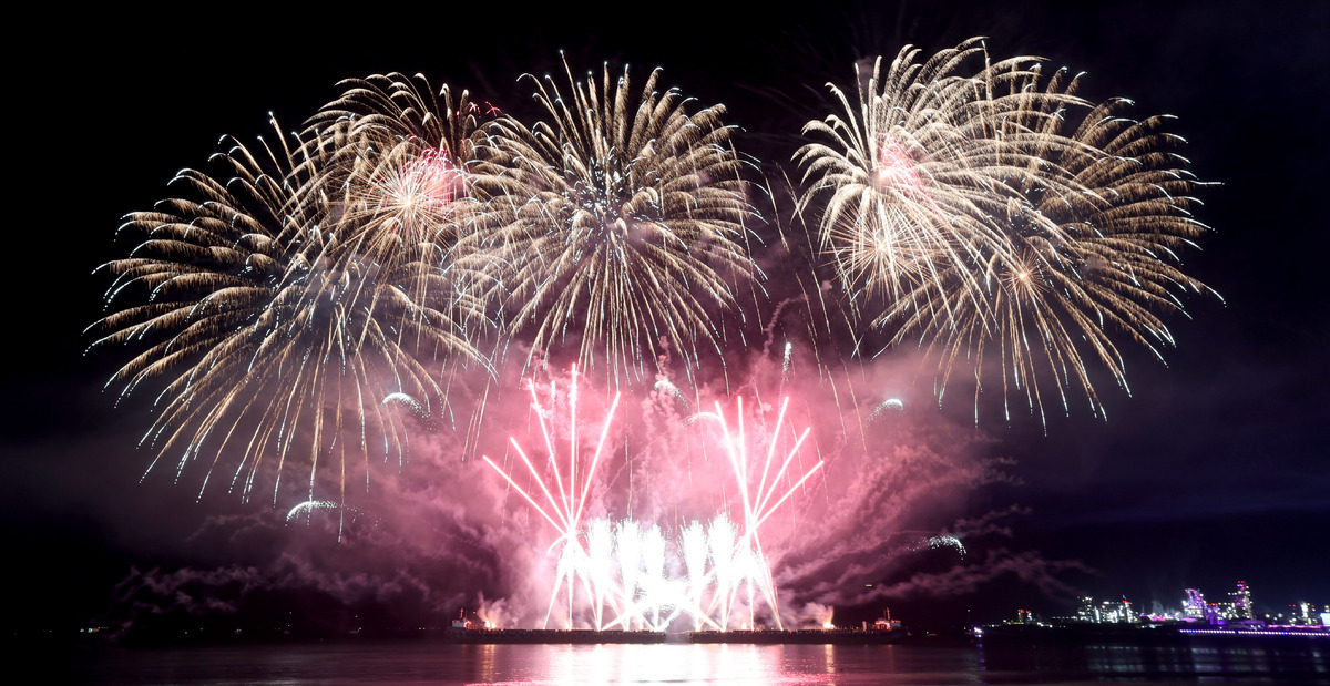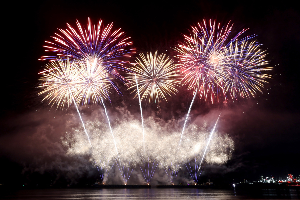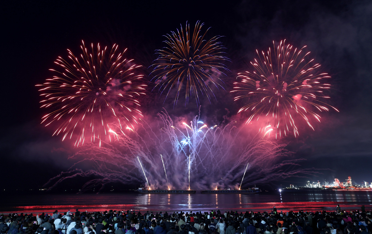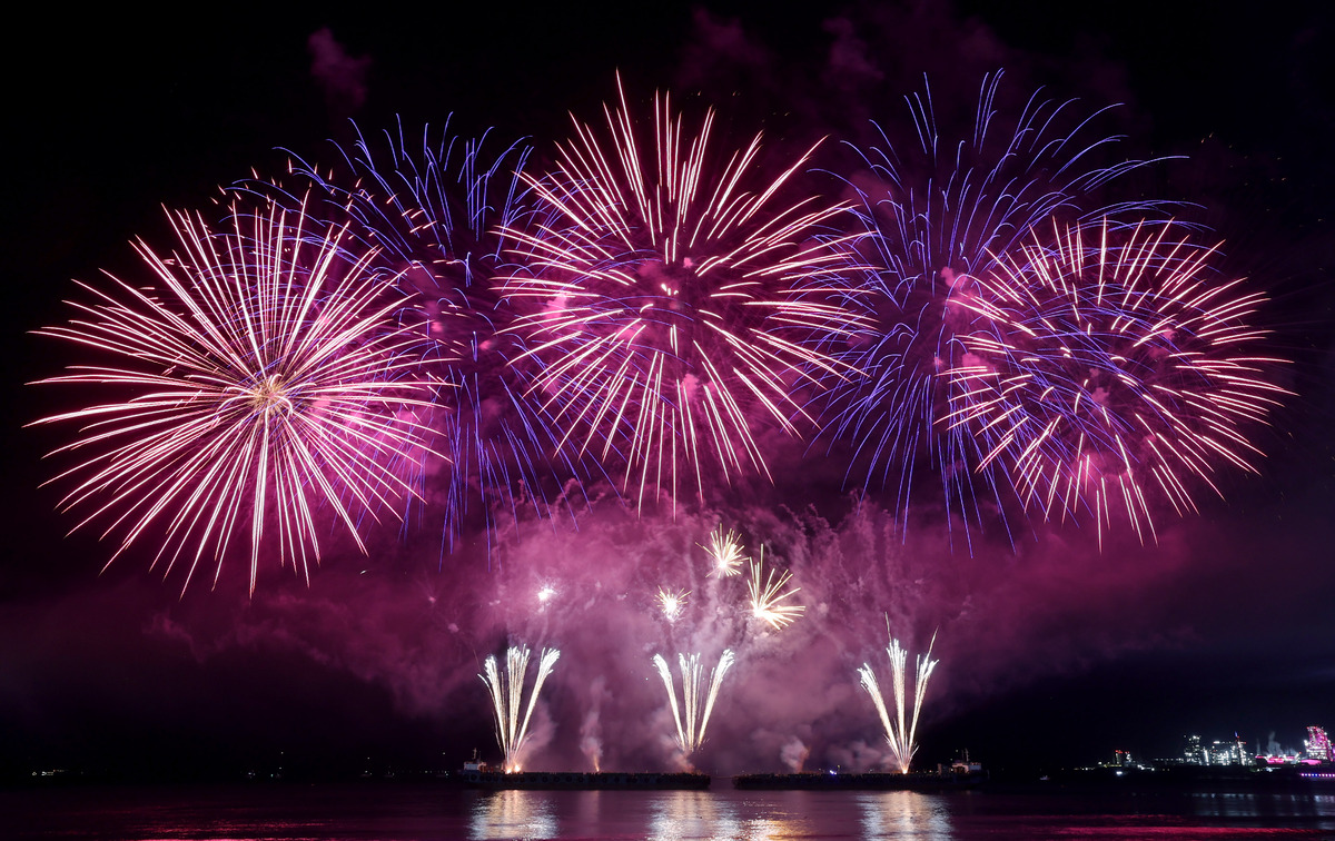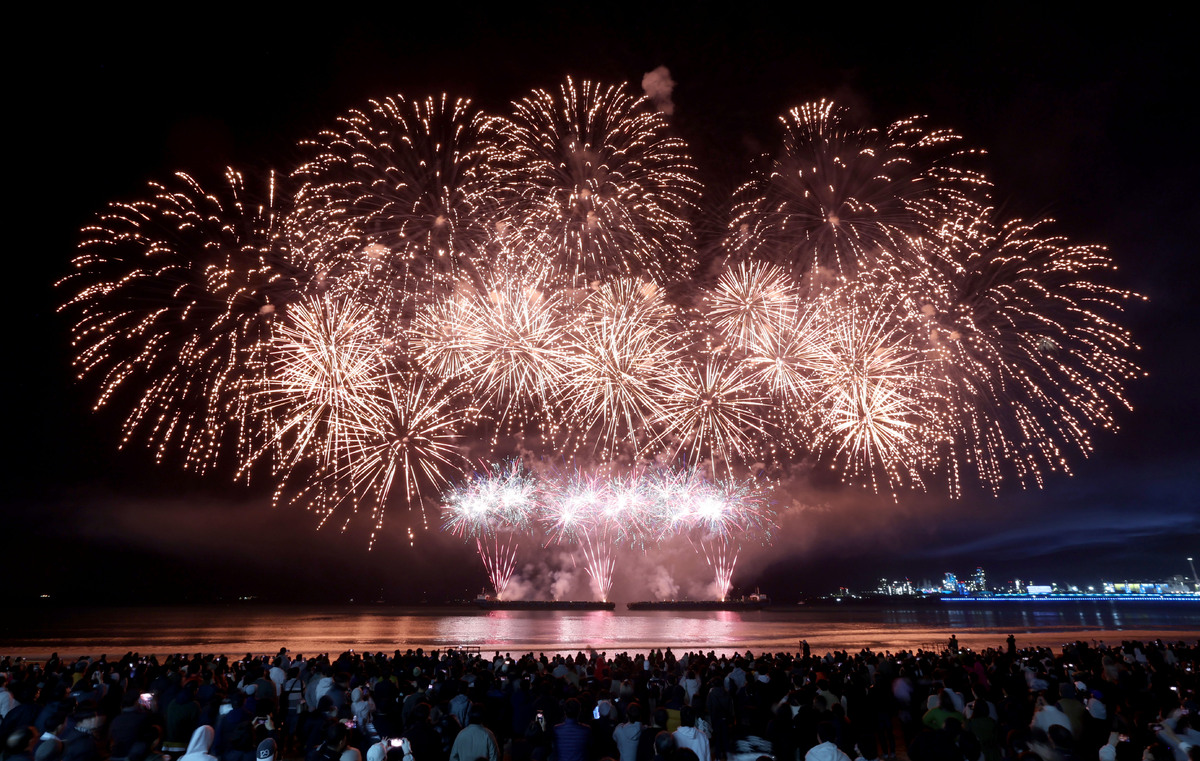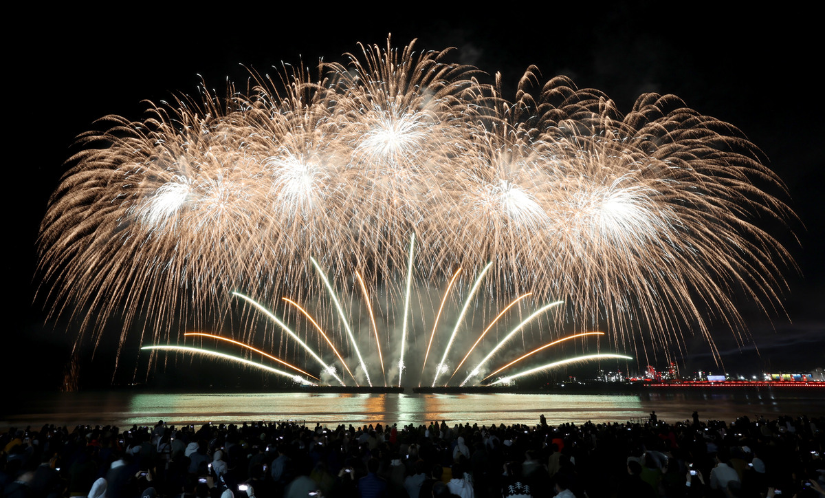 APEC 정상회의 기념 포항 불꽃 & 드론 쇼가 29일 오후 영일대 해수욕장에서 열렸다. 1만 5,000여 발의 화려한 불꽃이 영일만 밤하늘을 아름답게 수놓고 있다. /이용선기자 photokid@kbmaeil.com