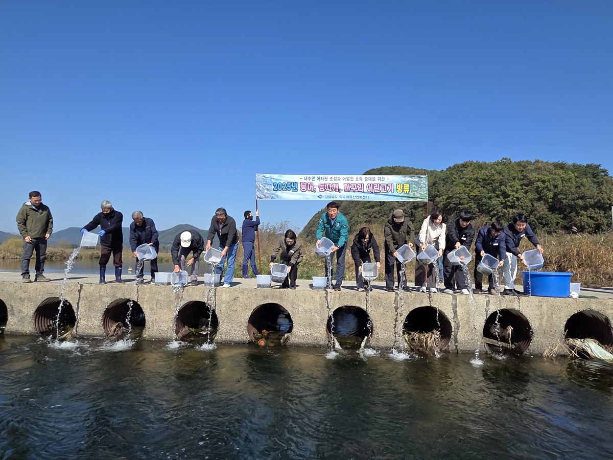 참석자들은 내수면 어자원 회복과 어업인 소득 증대를 기원하며 붕어, 동자개, 미꾸리 등 토종 민물고기 어린 고기 13만 마리와 다슬기 치패 13만 마리를 회천에 방류했다.