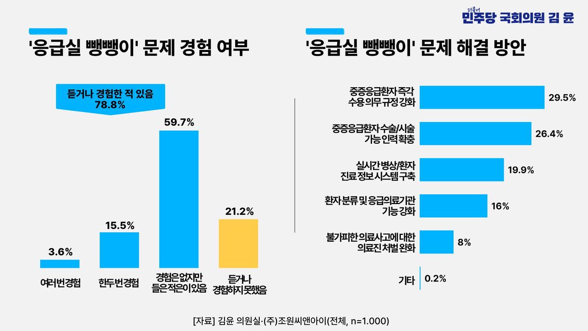 30일 더불어민주당 김윤<사진> 의원(국회 보건복지위원회, 비례대표)이 여론조사기관 ㈜조원씨앤아이에 의뢰해 실시한 대국민 설문조사 결과에 따르면, 응답자 10명 중 8명(78.8%)이 응급실 뺑뺑이를 경험하거나 들어본 적 있다고 답했다. 또 정부가 가장 먼저 추진해야 할 보건의료 정책으로 ‘응급의료체계 개편’(51.1%)이 1순위로 선정됐다.