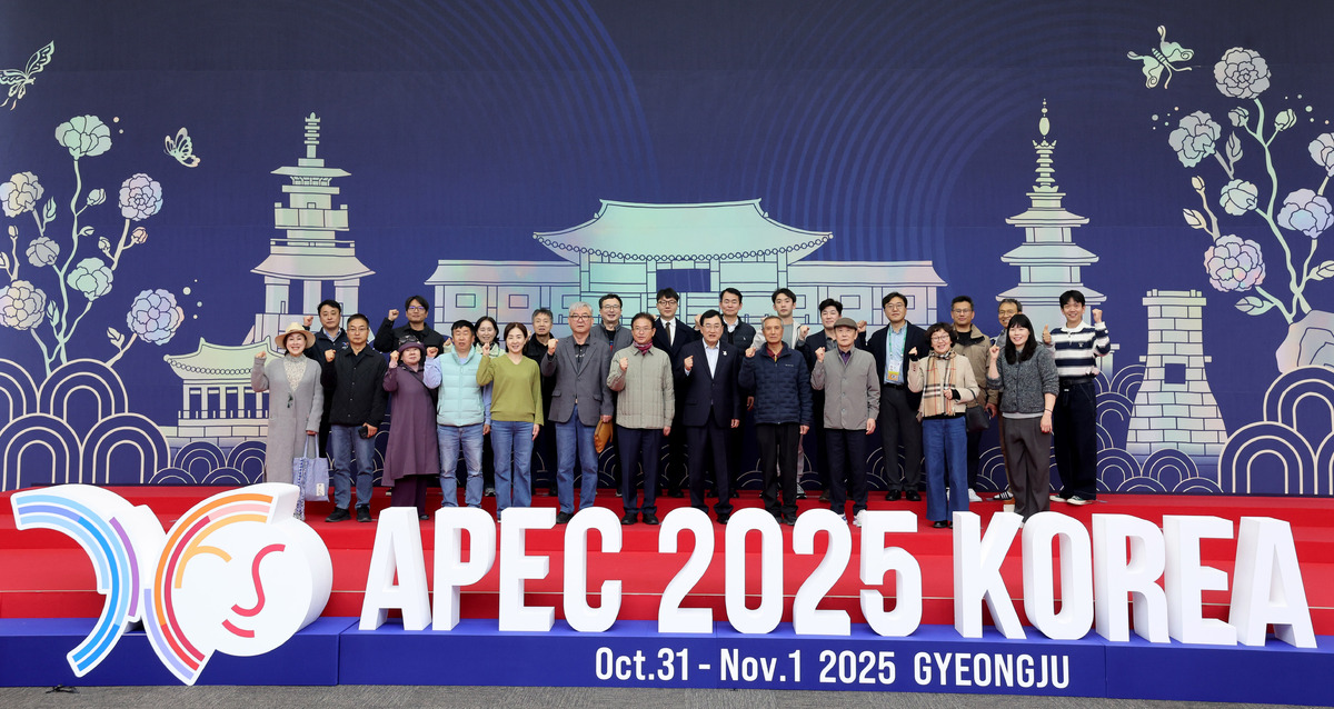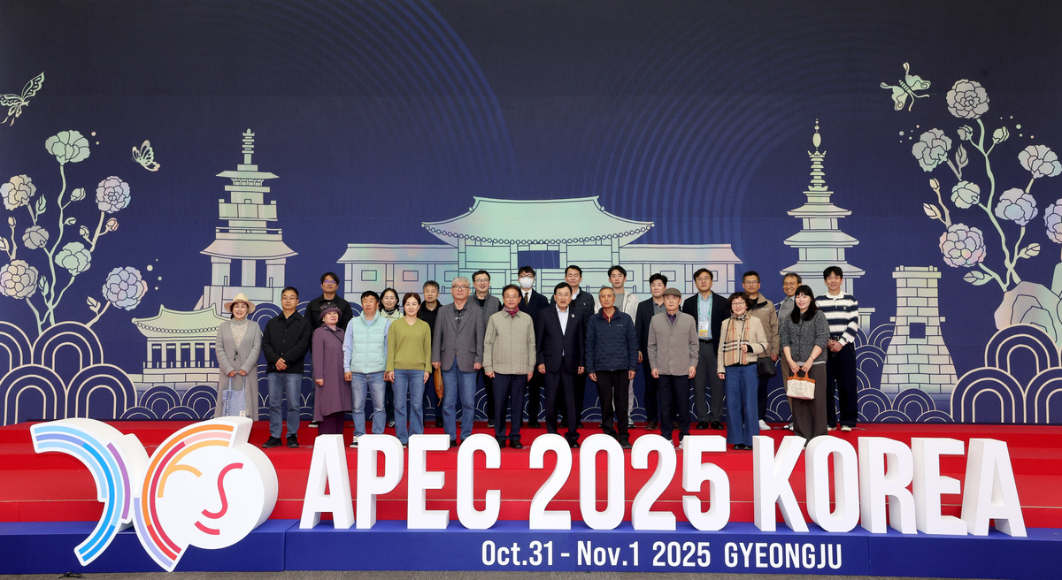 APEC 정상회의 준비로 고생한 직원을 격려하려고 2일 오후 경주 화백 컨벤션 센터를 방문한 이철우 경북도지사와 주낙영 경주시장이 각국 정상이 한자리에 모였던 공식 기념 촬영 현장에서 만난 시민들과 기념 촬영을 하고 있다. /이용선기자 photokid@kbmaeil.com