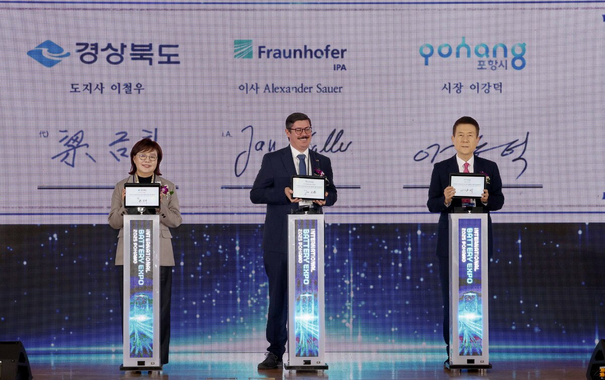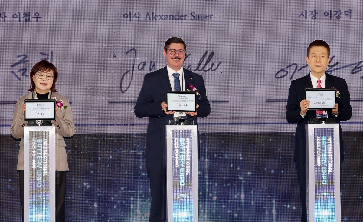 ‘국제 배터리 엑스포 2025 포항’ 개막식이 3일 오전 포스텍 체육관에서 열렸다. 개막식에 참석한 양금희 경북도 경제부지사, 알렉산더 자우어(Alexander Sauer) 프라운호퍼 IPA 이사, 이강덕 포항시장이 한국과 독일의 이차전지 협력 업무협약을 체결하고 있다. /이용선기자 photokid@kbmaeil.com