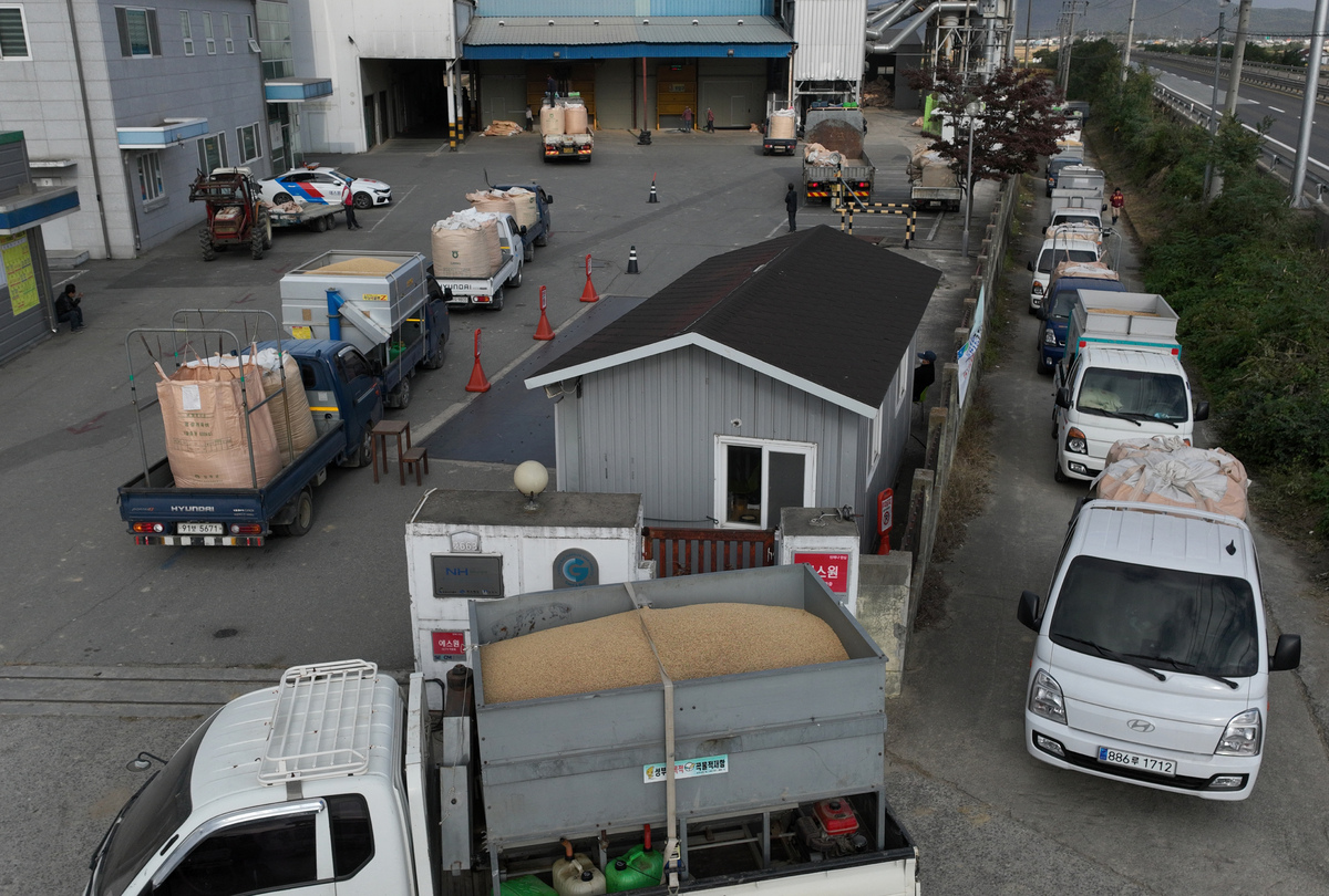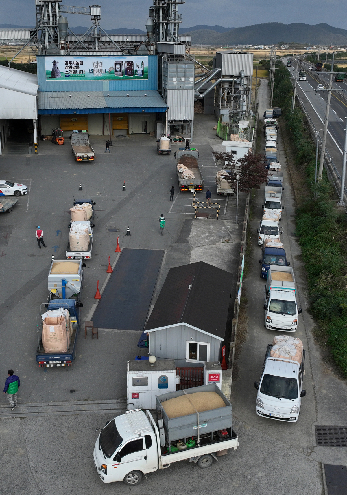 가을장마로 미뤄뒀던 본격적인 벼 수확이 시작된 가운데 각 단위 농협의 벼 수매도 한창이다. 4일 오후 경주시 안강읍 미곡종합처리장에 수매 순서를 기다리는 차량이 길게 줄지어 있다. /이용선기자 photokid@kbmaeil.com