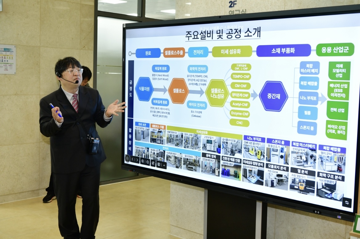 산업화센터는 총사업비 224억 원으로 부지 3000㎡에 전체 면적 2787㎡ 규모로 친환경 고기능성 나노 섬유 소재(CNF) 기반 시험·평가·제품화 지원 시스템을 갖춘 국내 유일의 나노 셀룰로스 산업화 기반 시설로 구축됐다.