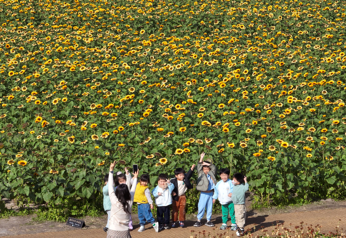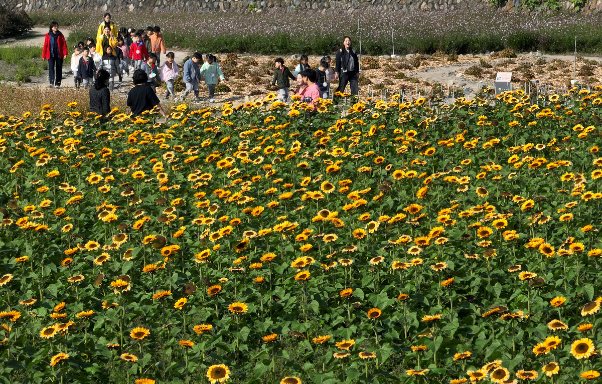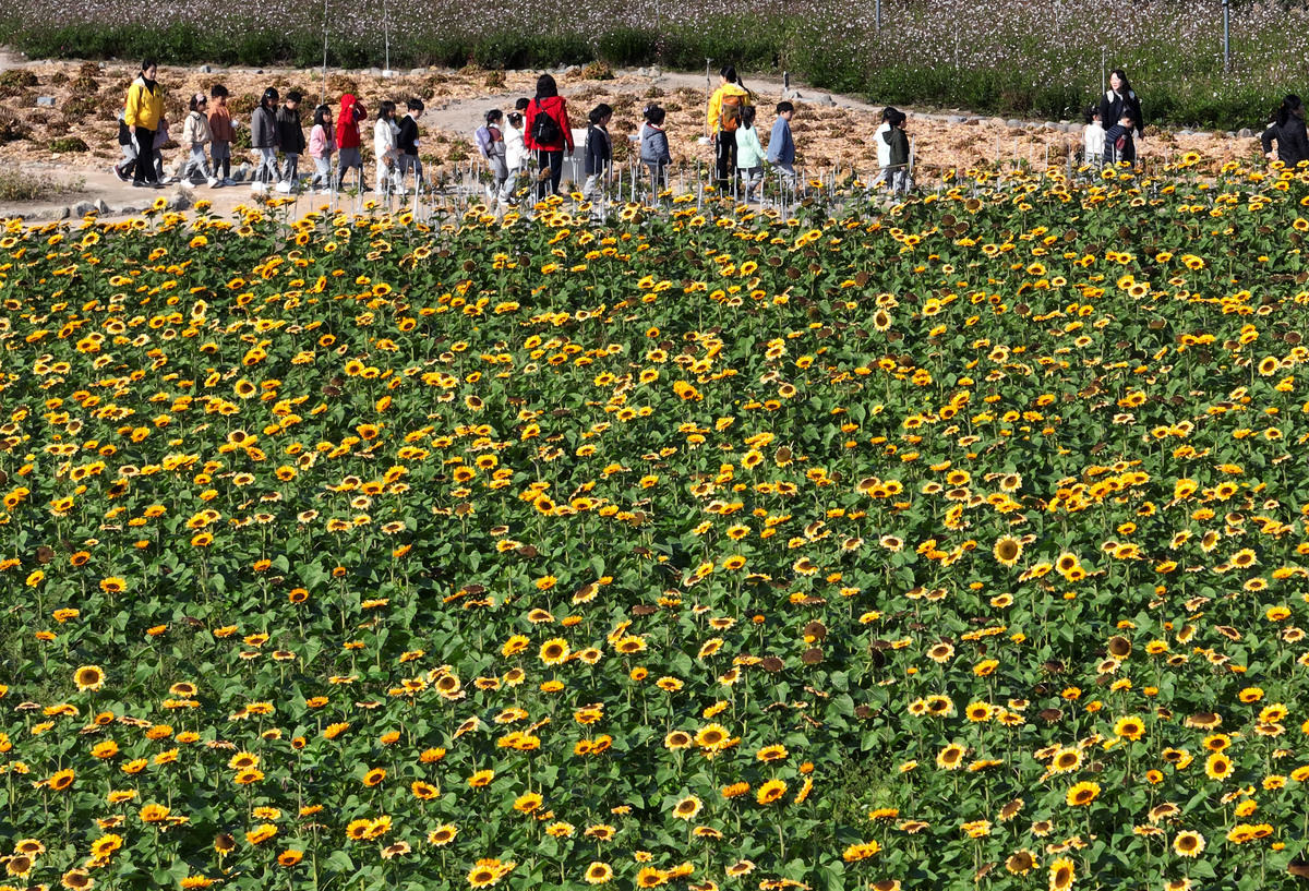 입동을 이틀 앞둔 5일 오후 포근한 가을 날씨를 보인 가운데 경주 동부사적지에 노란 해바라기꽃이 만개해 관광객의 발길을 사로잡고 있다. /이용선기자 photokid@kbmaeil.com