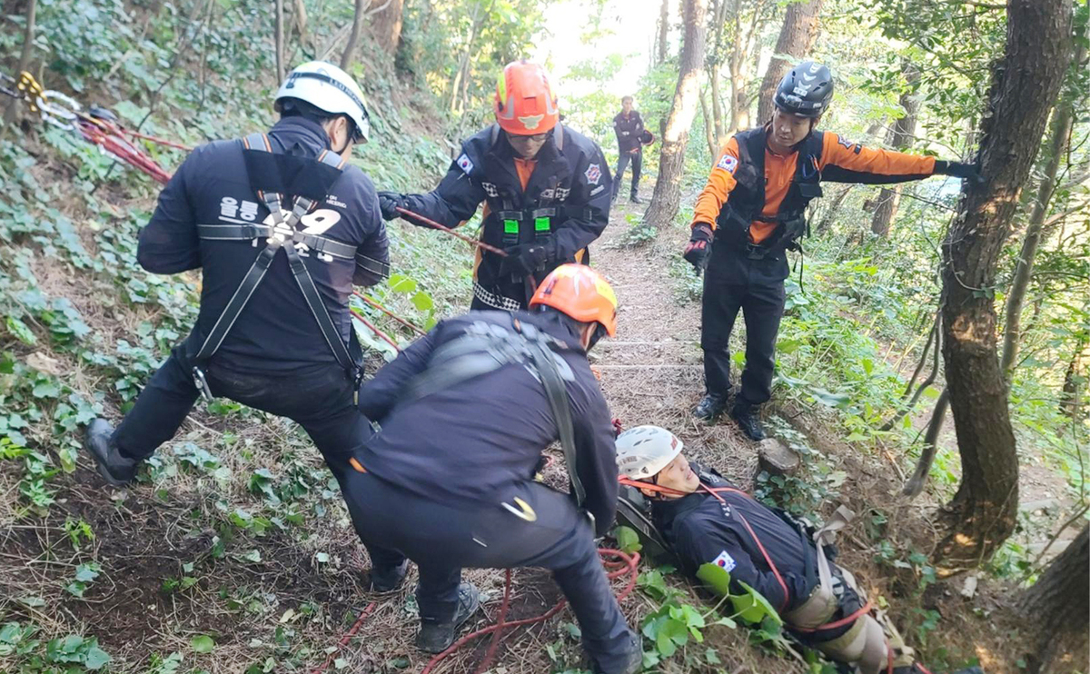 가을 단풍으로 물든 울릉도 성인봉 일대가 구조훈련 현장으로 변했다.
