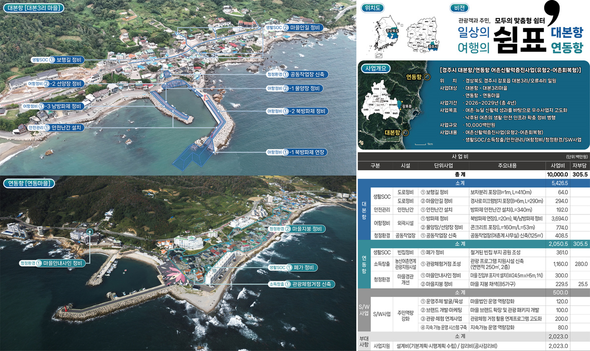 경주시는 감포읍 대본항과 연동항 일원에 총 103억 원(국비 70억 원, 지방비 30억 원, 자부담 3억 원)을 투입해 2026년부터 2029년까지 어항시설 정비와 관광 인프라 확충 사업을 본격 추진한다.