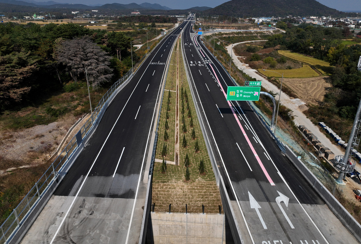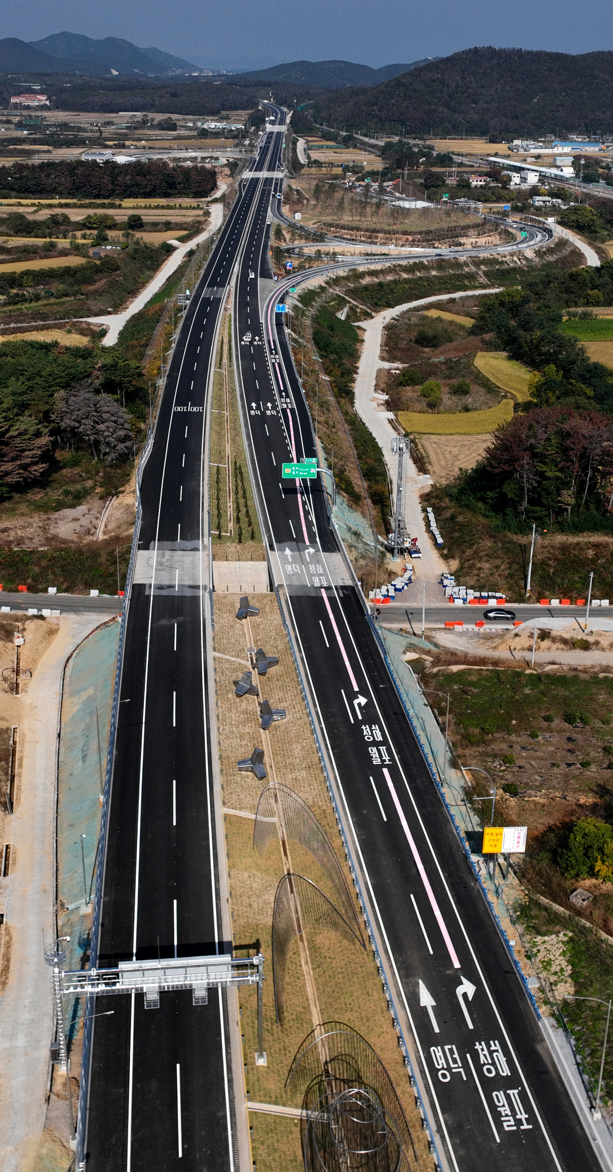 고속국도 제65호 동해선 포항∼영덕 구간이 오는 8일 오전 10시 개통한다. 이 구간은 연장 30.9㎞에 이르는 왕복 4차로로 총사업비 1조6,115억 원을 투입해 9년간의 공사를 거쳐 완공됐다. 이번 개통으로 포항시 북구 흥해읍에서 영덕군 강구면까지 이동시간이 약 23분 줄어들 전망이다. 6일 오전 포항시 북구 청하면 월포리 북포항IC 인근에서 영덕 방향으로 바라본 고속도로 전경. /이용선기자 photokid@kbmaeil.com