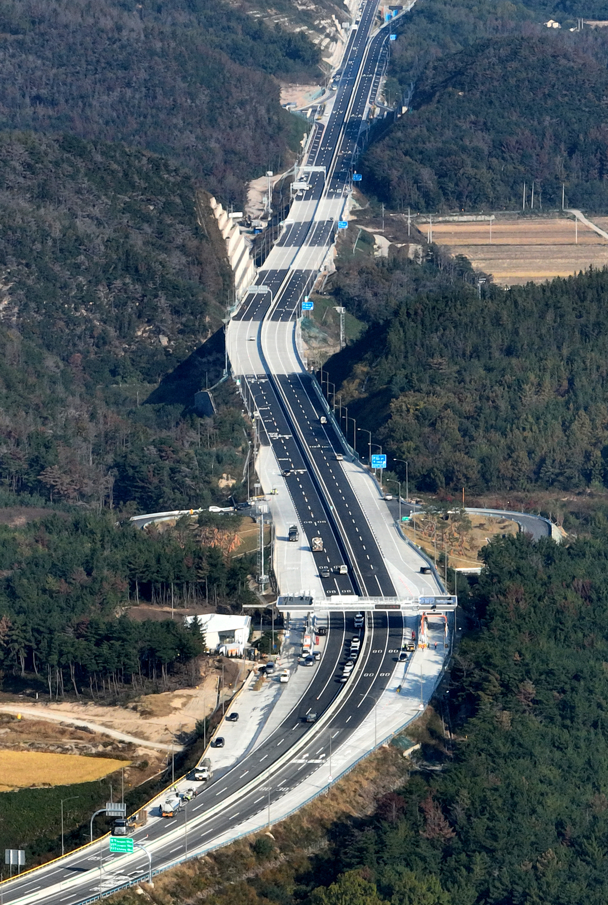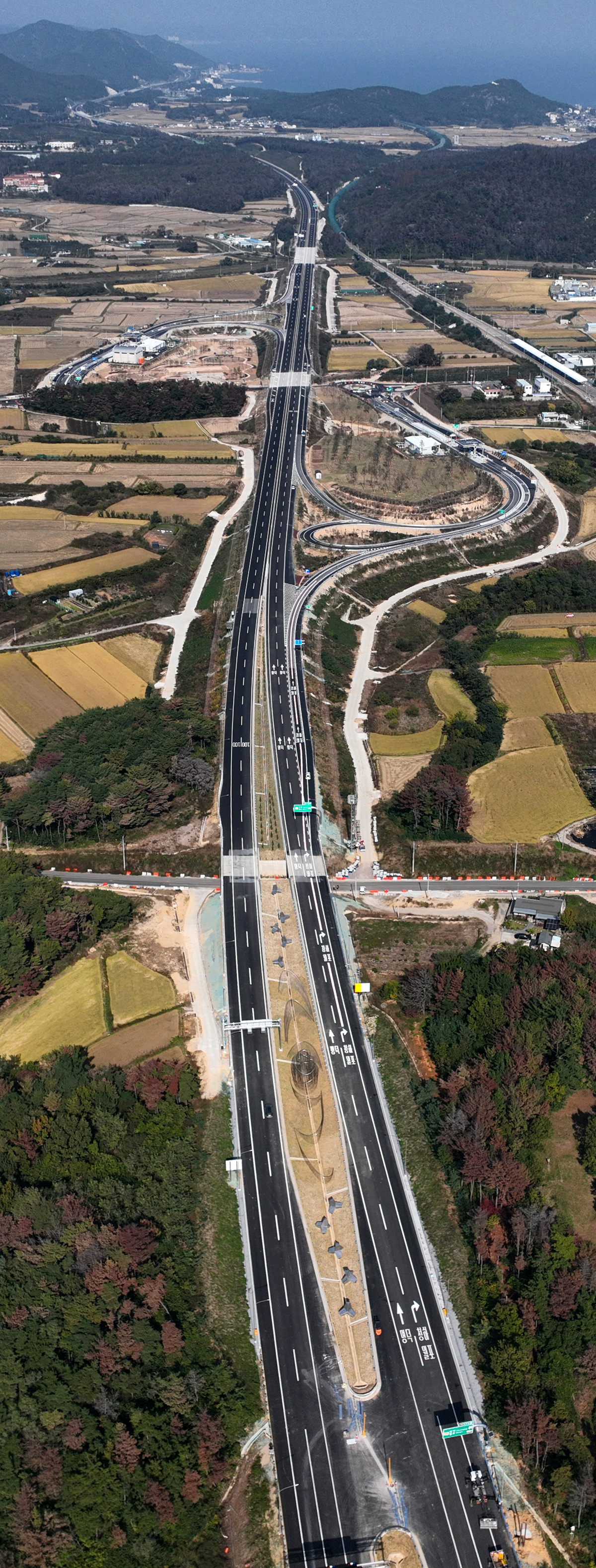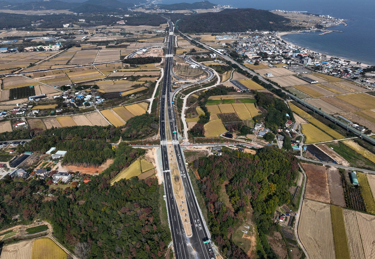 고속국도 제65호 동해선 포항∼영덕 구간이 오는 8일 오전 10시 개통한다. 이 구간은 연장 30.9㎞에 이르는 왕복 4차로로 총사업비 1조6,115억 원을 투입해 9년간의 공사를 거쳐 완공됐다. 이번 개통으로 포항시 북구 흥해읍에서 영덕군 강구면까지 이동시간이 약 23분 줄어들 전망이다. 6일 오전 포항시 북구 흥해읍 남송리 영일만IC 인근에서 영덕 방향으로 바라본 고속도로 전경. /이용선기자 photokid@kbmaeil.com