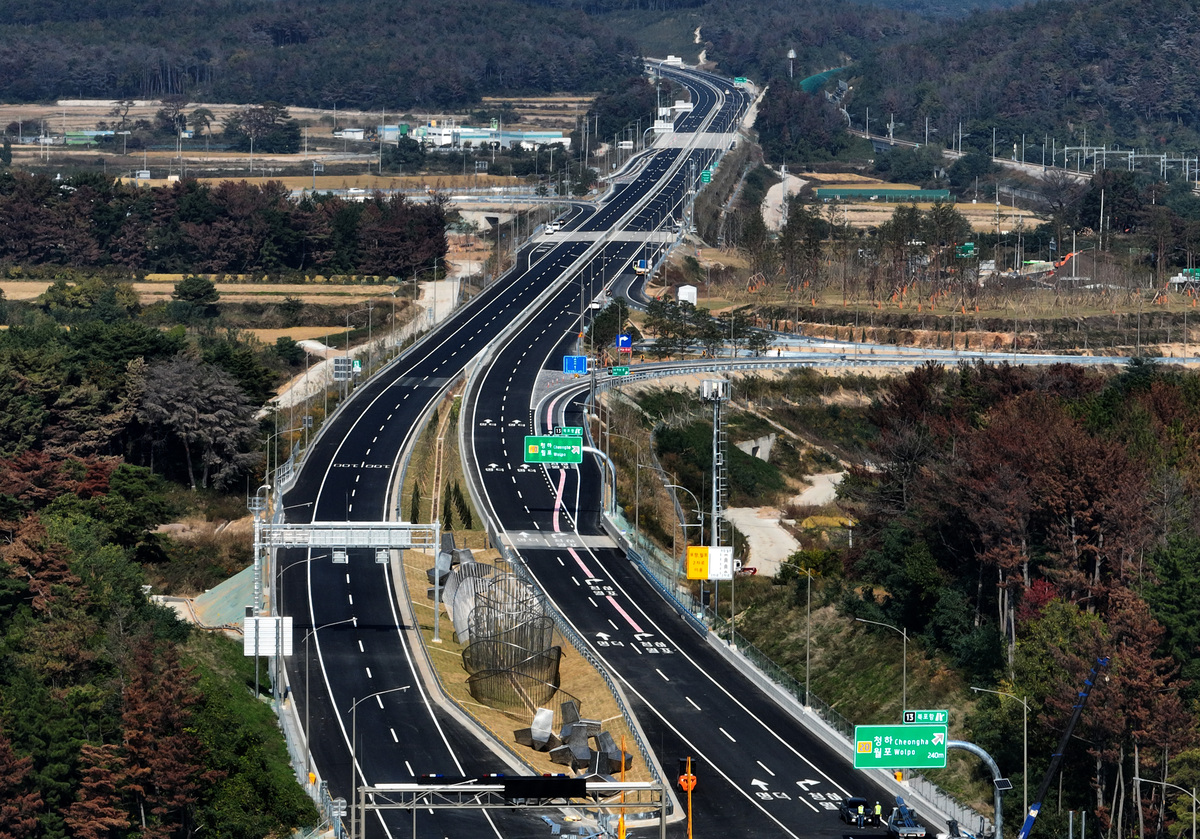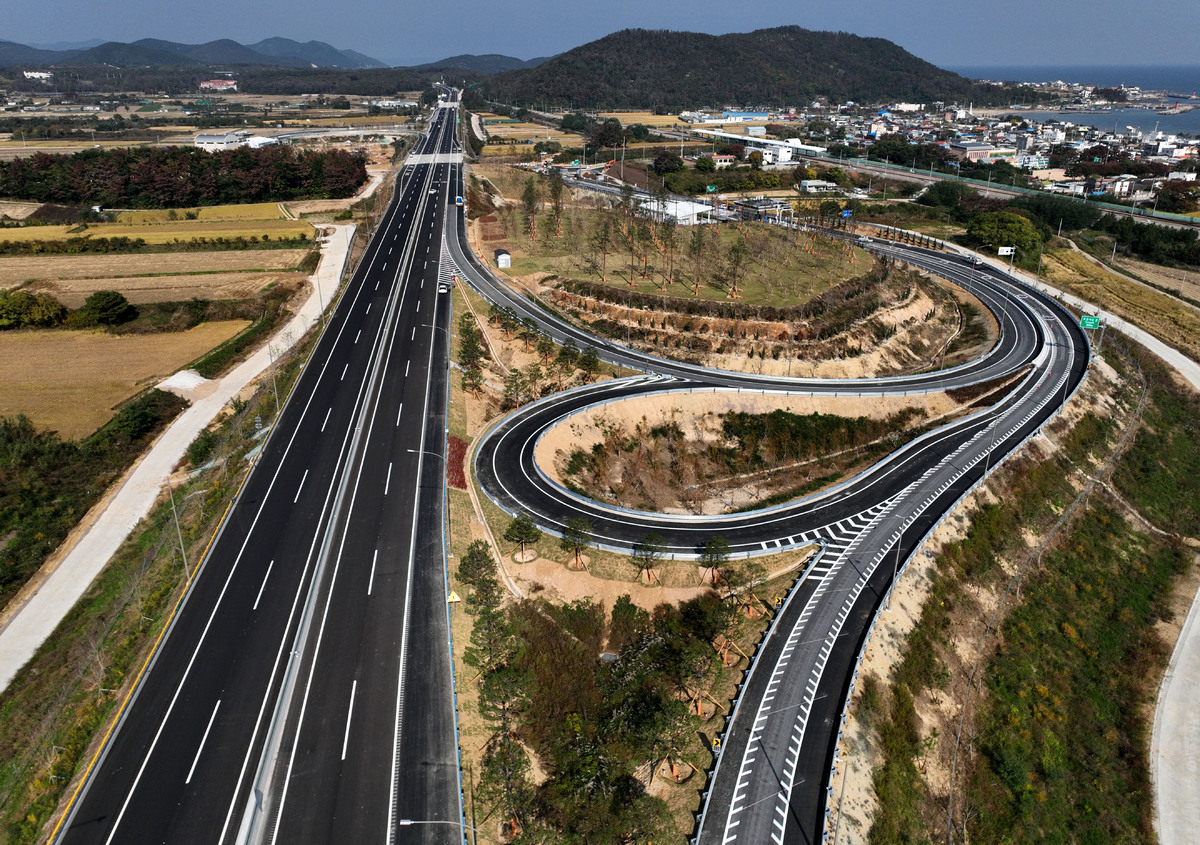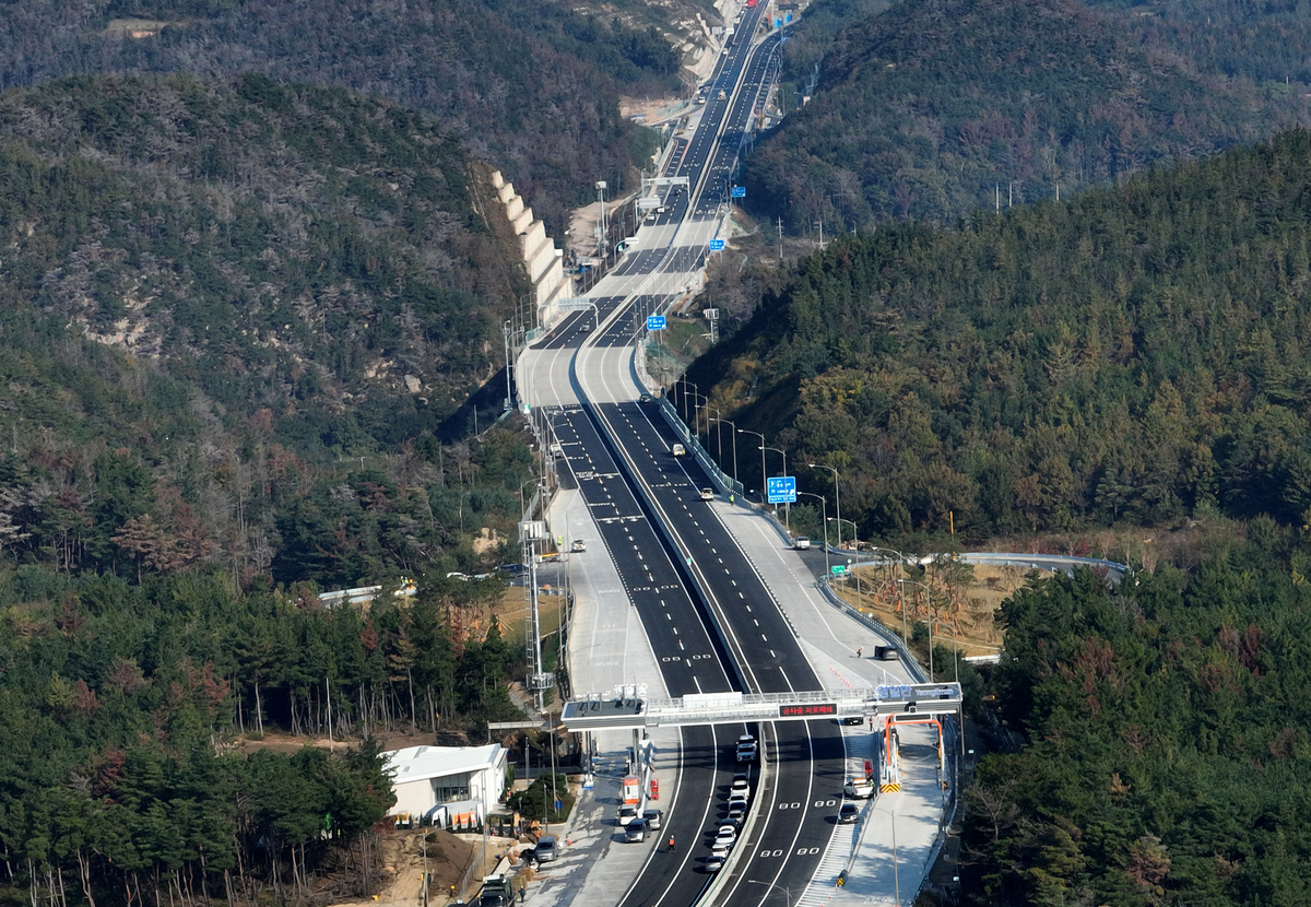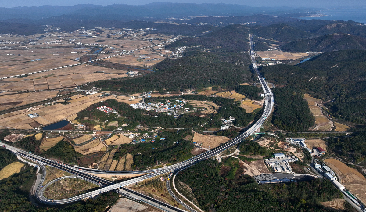고속국도 제65호 동해선 포항∼영덕 구간이 오는 8일 오전 10시 개통한다. 이 구간은 연장 30.9㎞에 이르는 왕복 4차로로 총사업비 1조6,115억 원을 투입해 9년간의 공사를 거쳐 완공됐다. 이번 개통으로 포항시 북구 흥해읍에서 영덕군 강구면까지 이동시간이 약 23분 줄어들 전망이다. 6일 오전 포항시 북구 흥해읍 남송리 영일만IC 인근에서 영덕 방향으로 바라본 고속도로 전경. /이용선기자 photokid@kbmaeil.com