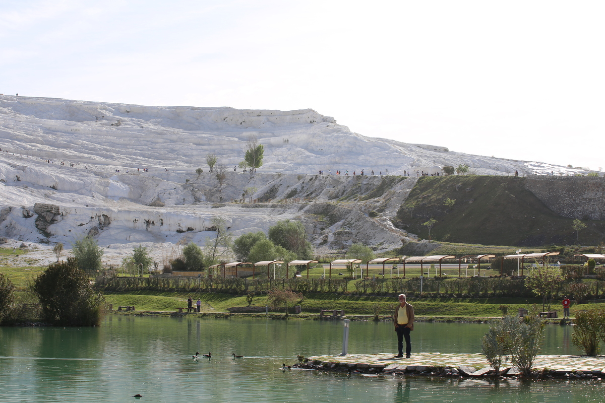 또 한 곳의 고대 도시는 석회층 온천지대인 파묵칼레 위에 있다. 유네스코 세계자연유산인 파묵칼레는 ‘목화의 성’이라는 뜻을 담고 있다. 터키를 홍보하는 책자에 빠짐없이 나오는 파묵칼레는 마치 계단식 다랑이논처럼 생겼다. 소금의 벽을 겹겹이 쌓아 놓은 것 같은 하얀 석회층이 절벽 한 면을 빼곡히 채우고 있고 그 아래로 석회를 머금은 웅덩이들이 청아하게 빛난다. 이 석회층은 오랜 시간을 두고 관찰해야 한다. 아침에 푸르던 물빛이 햇살이 따가워지는 낮에는 흰색이 되고, 석양이 물들기 시작하면 붉은 색으로 변한다.