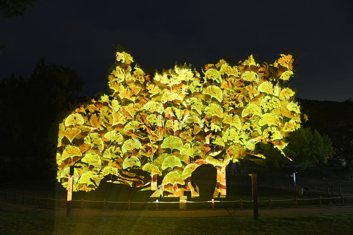달성군은 오는 15일까지 은행나무를 배경으로 한 미디어 파사드를 선보이고 있다. 샛노랗게 물든 은행나무 사이로 영상이 투사되며 빛과 소리가 어우러진 ‘빛의 향연’이 펼쳐진다.