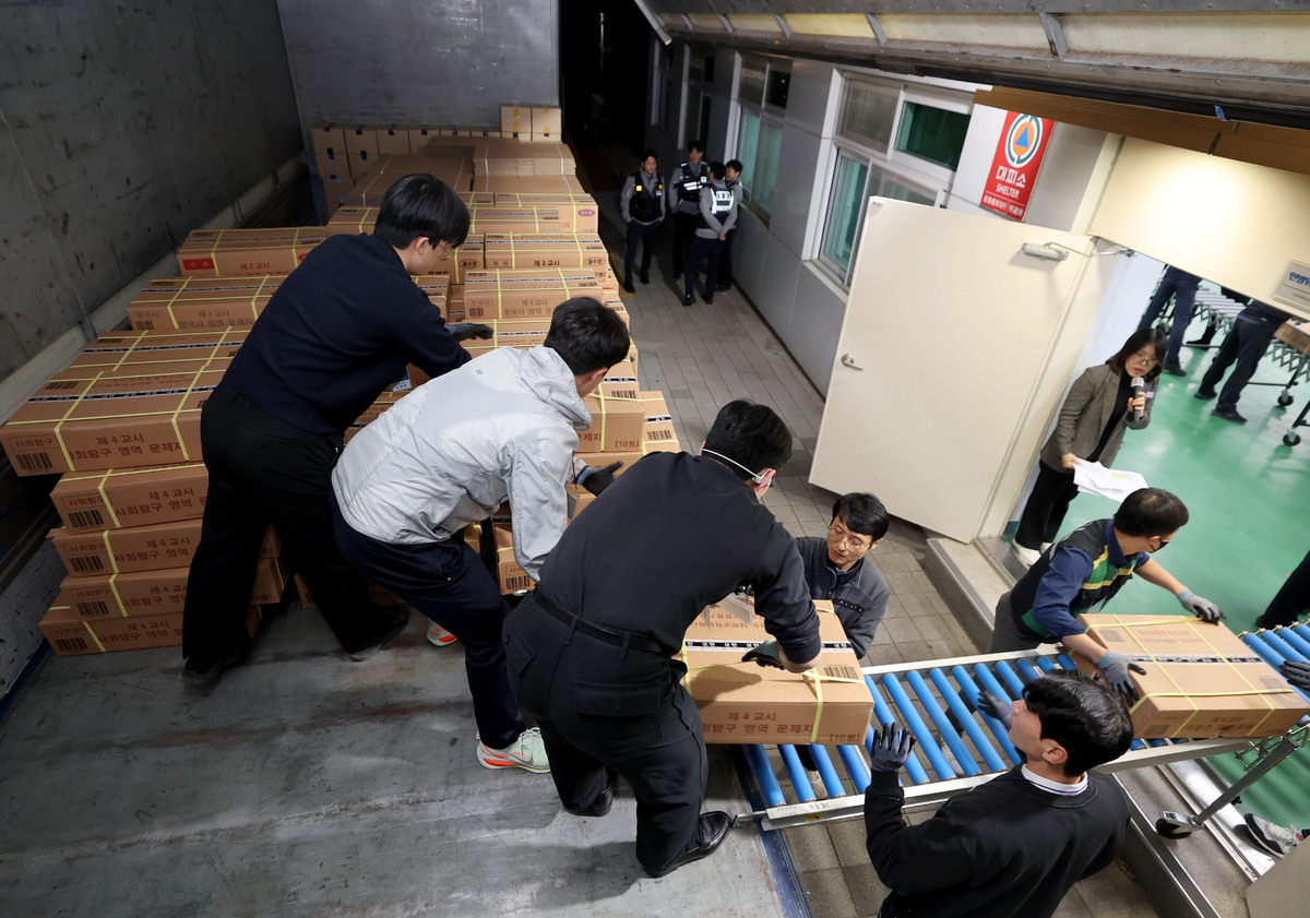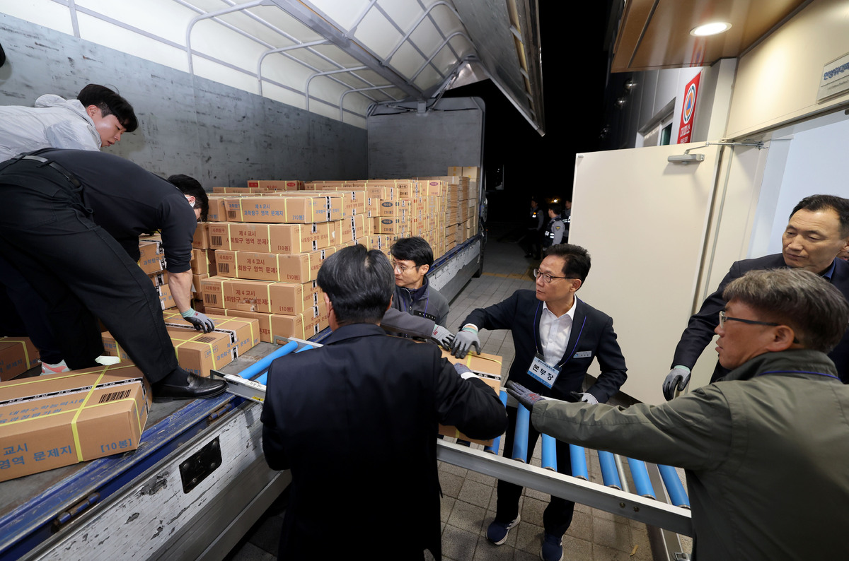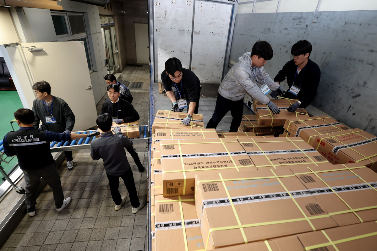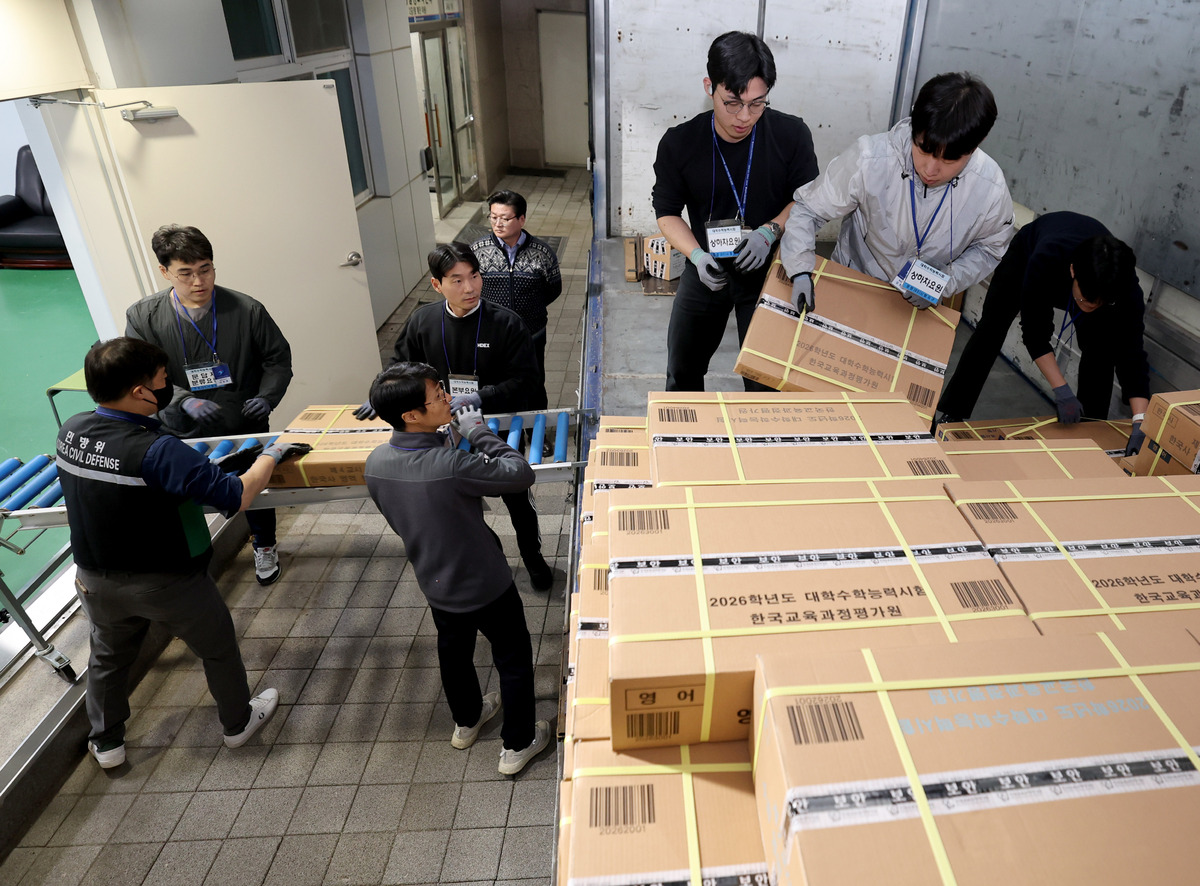 2026학년도 대학수학능력시험을 사흘 앞둔 10일 오후 전국 85개 시험지구에 수능 문제지와 답안지 이송이 시작된 가운데 포항교육지원청 관계자들이 문답지를 옮기고 있다. /이용선기자 photokid@kbmaeil.com