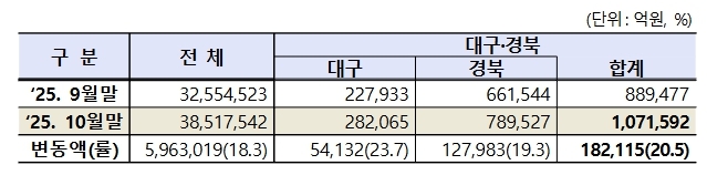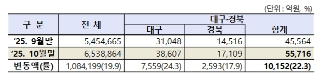 10월 대구·경북 투자자의 거래대금은 5조 5716억 원으로 전월 대비 22.3% 증가했다. 개인 투자자(21.7%↑, 9428억원), 기타법인(25.6%↑, 383억 원), 금융투자(66.4%↑, 295억 원)의 매수 확대가 영향을 미쳤다. 전체 시장 거래대금 대비 지역 비중은 0.9%로 전월(0.8%) 대비 0.1%p 상승했다.