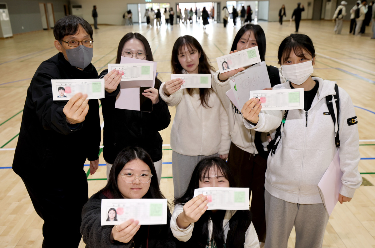 2026학년도 대입 수학능력시험 예비 소집이 시행된 12일 오후 포항 영일고등학교에서 수험표를 받은 학생들이 담임선생님과 수능 대박을 외치고 있다. /이용선기자 photokid@kbmaeil.com