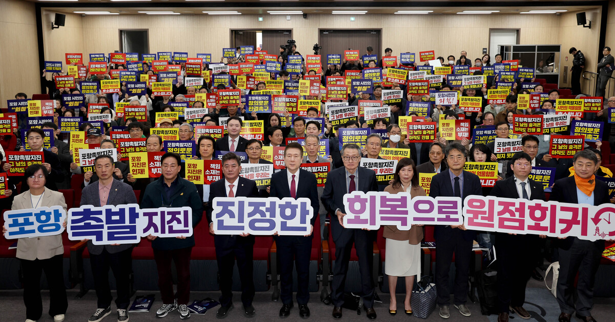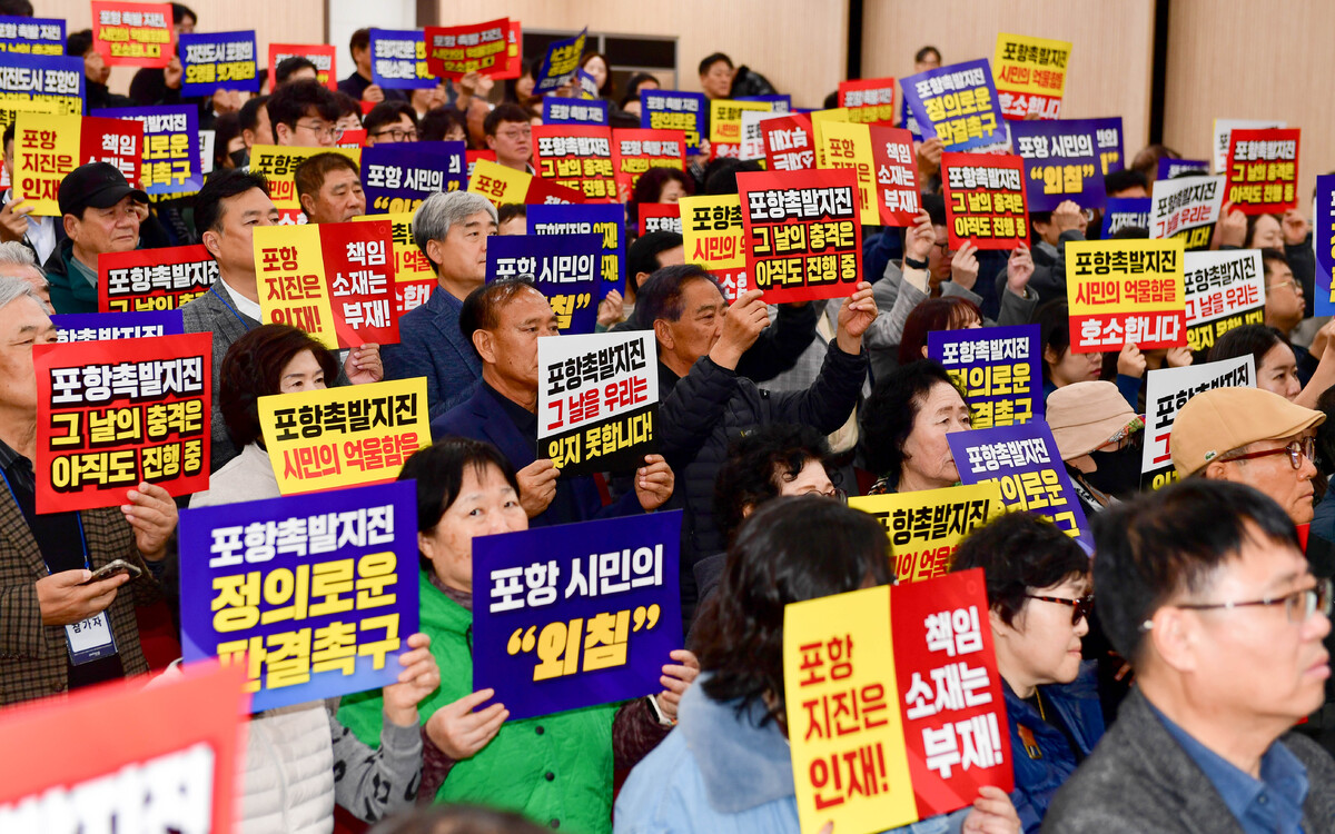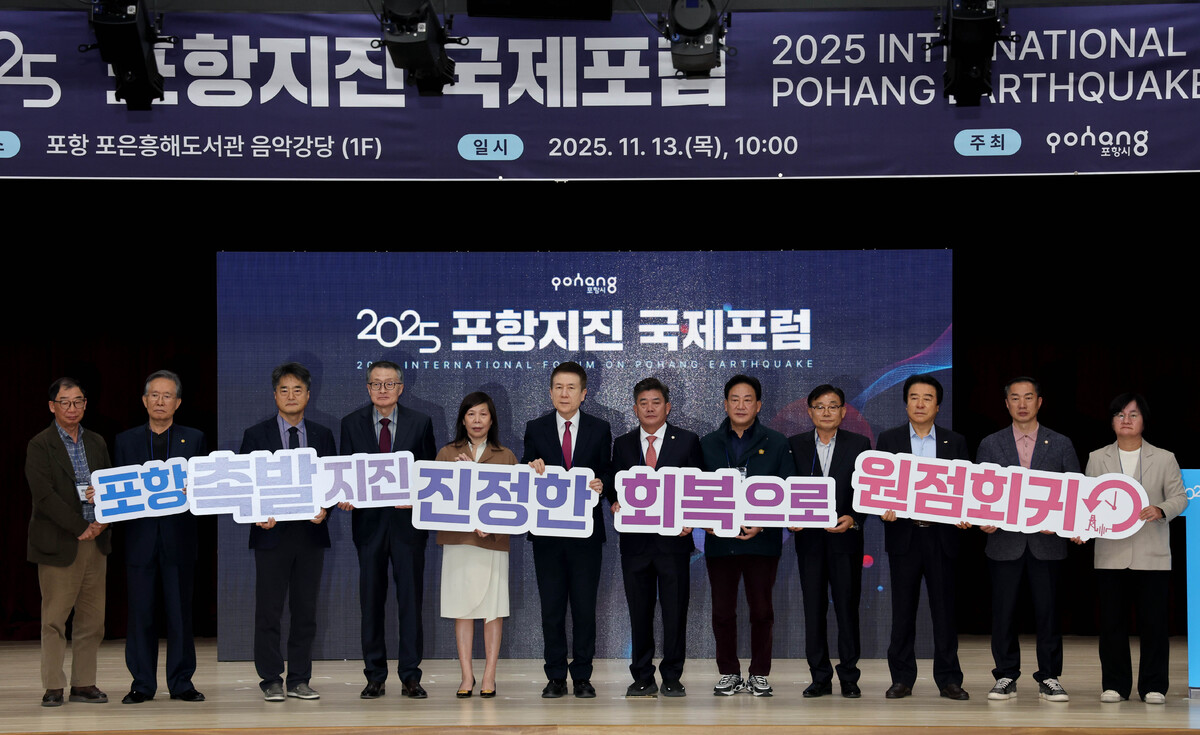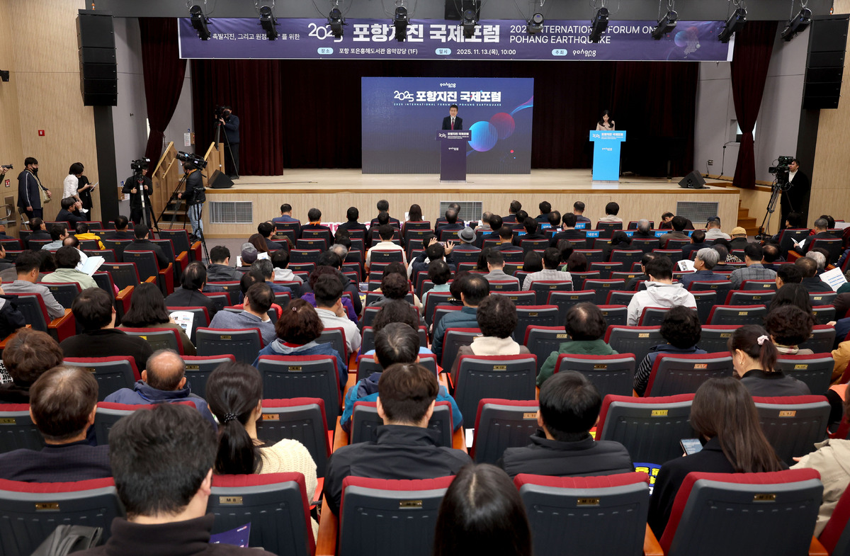 ‘2025 포항지진 국제포럼’이 11.15 포항지진 발생 8주년을 앞둔 13일 오전 포은흥해도서관에서 열렸다. 국내외 지진전문가와 내빈, 시민들이 함께 지진 트라우마 회복과 책임소재 규명을 요구하는 퍼포먼스를 하고 있다. /이용선기자 photokid@kbmaeil.com