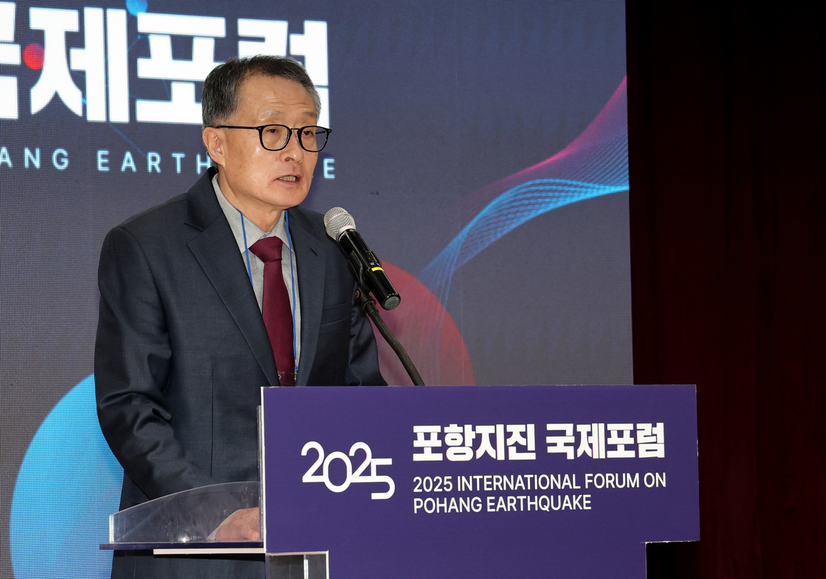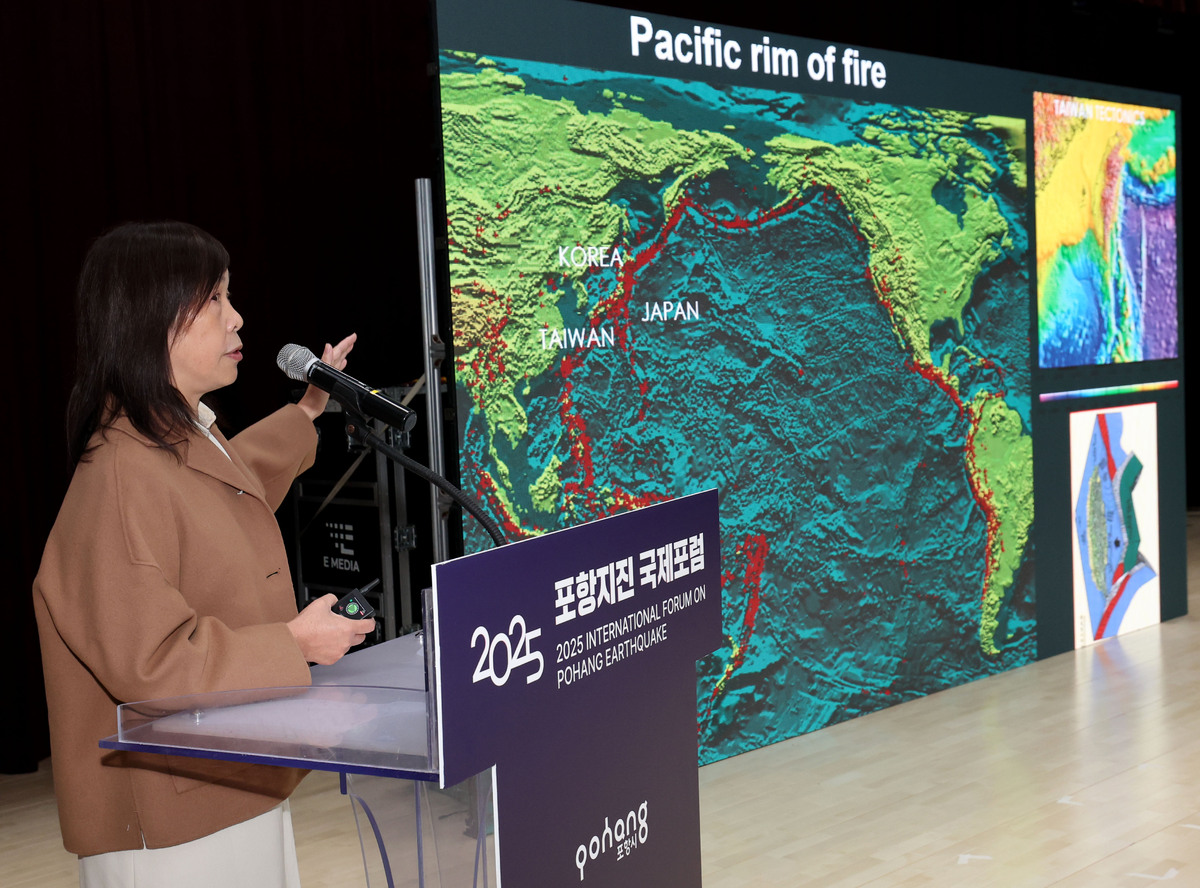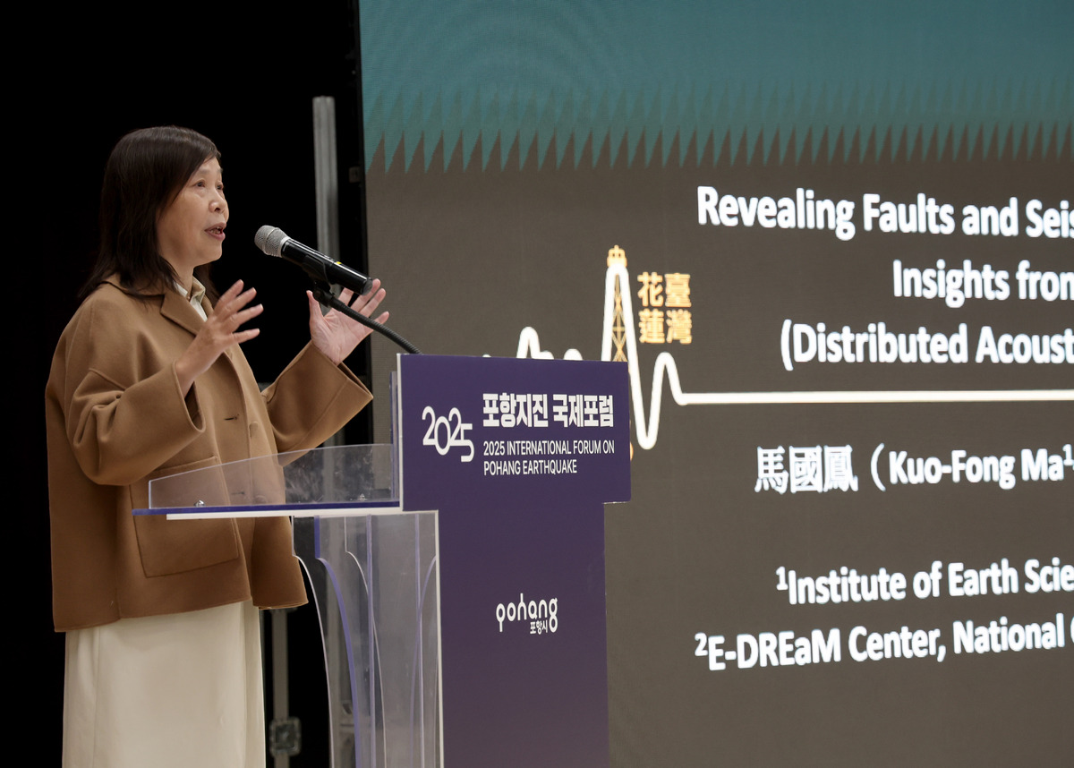 지진전문가인 대만중앙연구원 쿠오펑 마 박사가 ‘광섬유를 통한 단층과 지진 활동의 규명’을 주제로 기조연설하고 있다. /이용선기자 photokid@kbmaeil.com