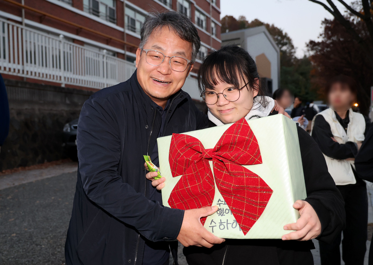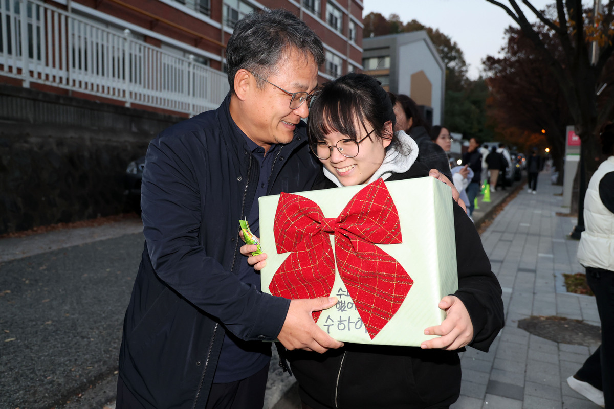 2026학년도 수학능력시험이 시행된 13일 오후 포항 유성여고에서 아버지가 수능에서 해방된 딸에게 선물을 주고 있다. /이용선기자 photokid@kbmaeil.com