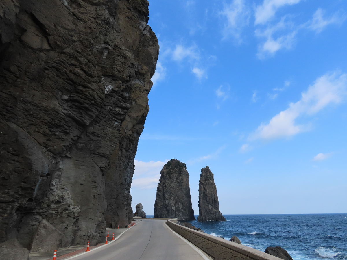 관음도를 빠져나와 삼선암 방향 도로를 따라 걷는다. 섬목에서 10여분이면 삼선암 바로 앞까지 갈 수 있다. 멀리서 보던 삼선암을 바로 앞에서 보니 그 풍경이 압도적이다. 멀리서는 삼선암, 세 선녀가 나란히 서 있는 듯 보였는데 가까이 와 보니 막내 선녀 바위만 뚝 떨어져 있다. 가혹하기도 하다.