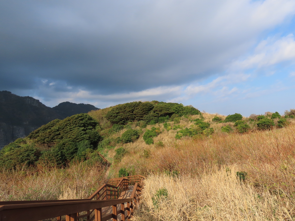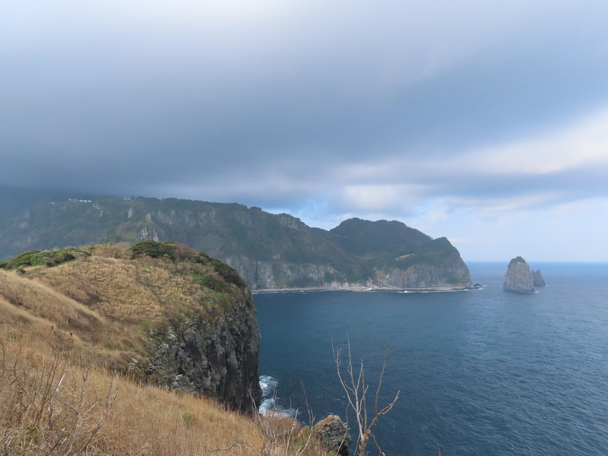 관음도 초입은 후박나무와 동백나무 군락이다. 강한 바닷바람에 잎들이 바짝 타버렸다. 관음도는 일부만 숲이 남아 있고 대부분은 초지다. 농사를 짓고 살던 시절의 유산이다. 관음도 전망대에 서니 건너편 절벽 위 건물들이 아찔하다. 안용복 기념관과 석포 마을의 집들이다.