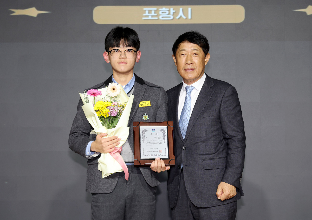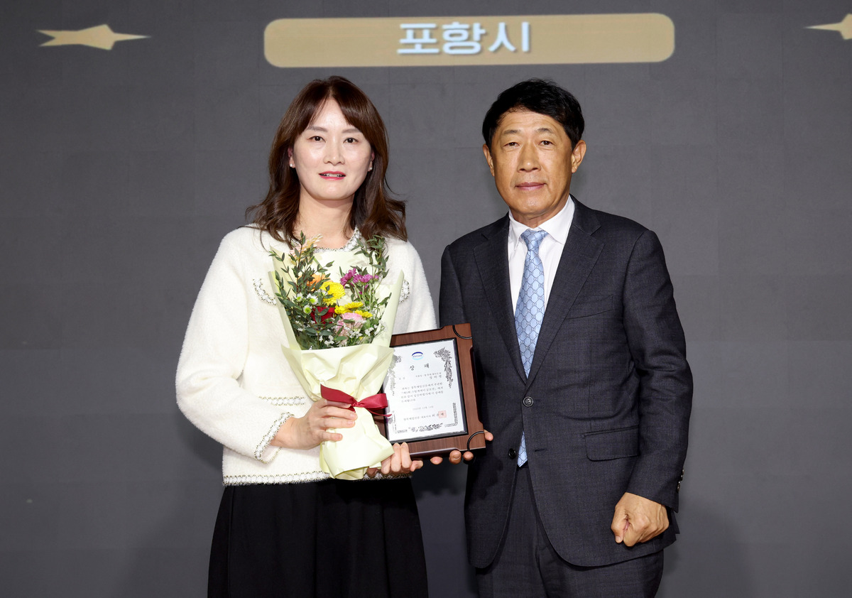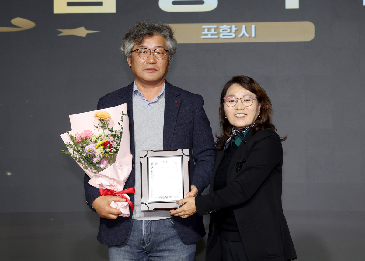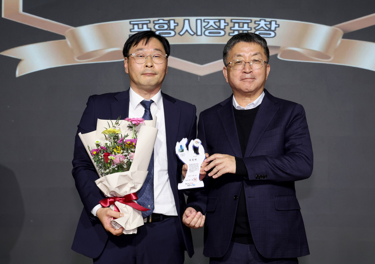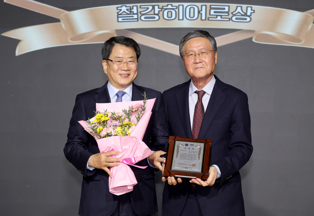 경북매일신문이 주최·주관하고 경북도·포항시·포항철강산업단지관리공단이 후원한 ‘2025 포항철강산업대전’이 지난 14일 오후 포항시청 대회의실에서 열렸다. 이날 행사는 철강산업대상, 스틸에세이, 포토스틸에세이 시상식과 ‘소통왕 말자 할매 토크 콘서트’가 함께 열렸다. 전익현 포항철강관리공단 이사장(우측)이 김윤수 (주)디에스아이 대표이사에게 철강히어로상을 전달하고 있다. /이용선기자 photokid@kbmaeil.com