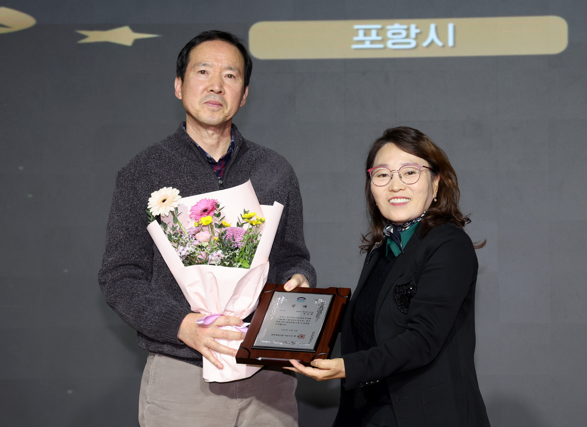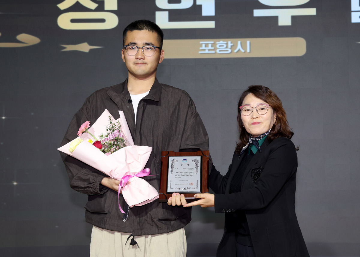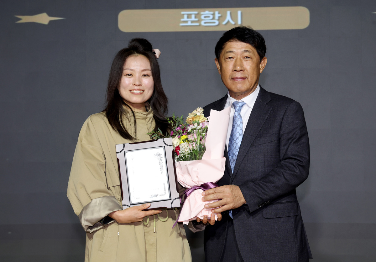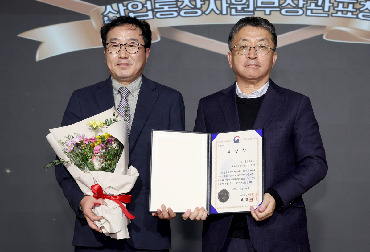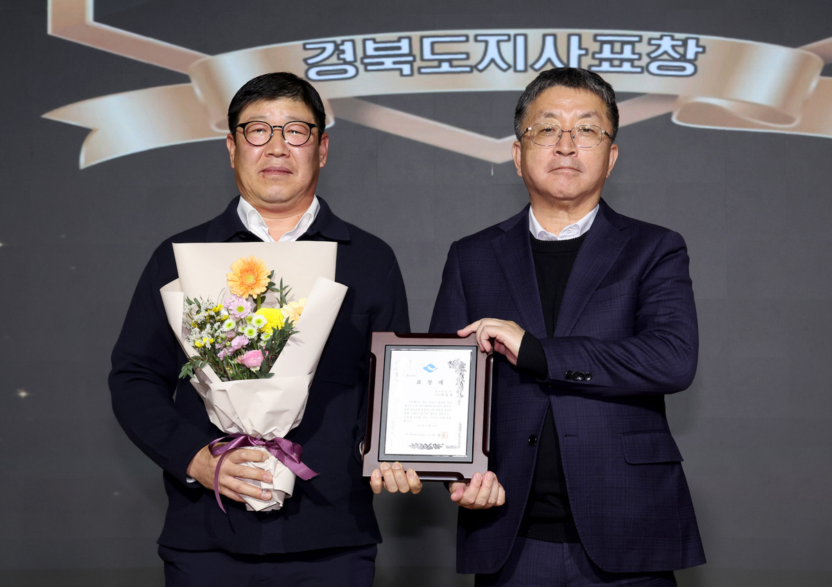 경북매일신문이 주최·주관하고 경북도·포항시·포항철강산업단지관리공단이 후원한 ‘2025 포항철강산업대전’이 지난 14일 오후 포항시청 대회의실에서 열렸다. 이날 행사는 철강산업대상, 스틸에세이, 포토스틸에세이 시상식과 ‘소통왕 말자 할매 토크 콘서트’가 함께 열렸다. 전익현 포항철강관리공단 이사장(우측)이 김윤수 (주)디에스아이 대표이사에게 철강히어로상을 전달하고 있다. /이용선기자 photokid@kbmaeil.com