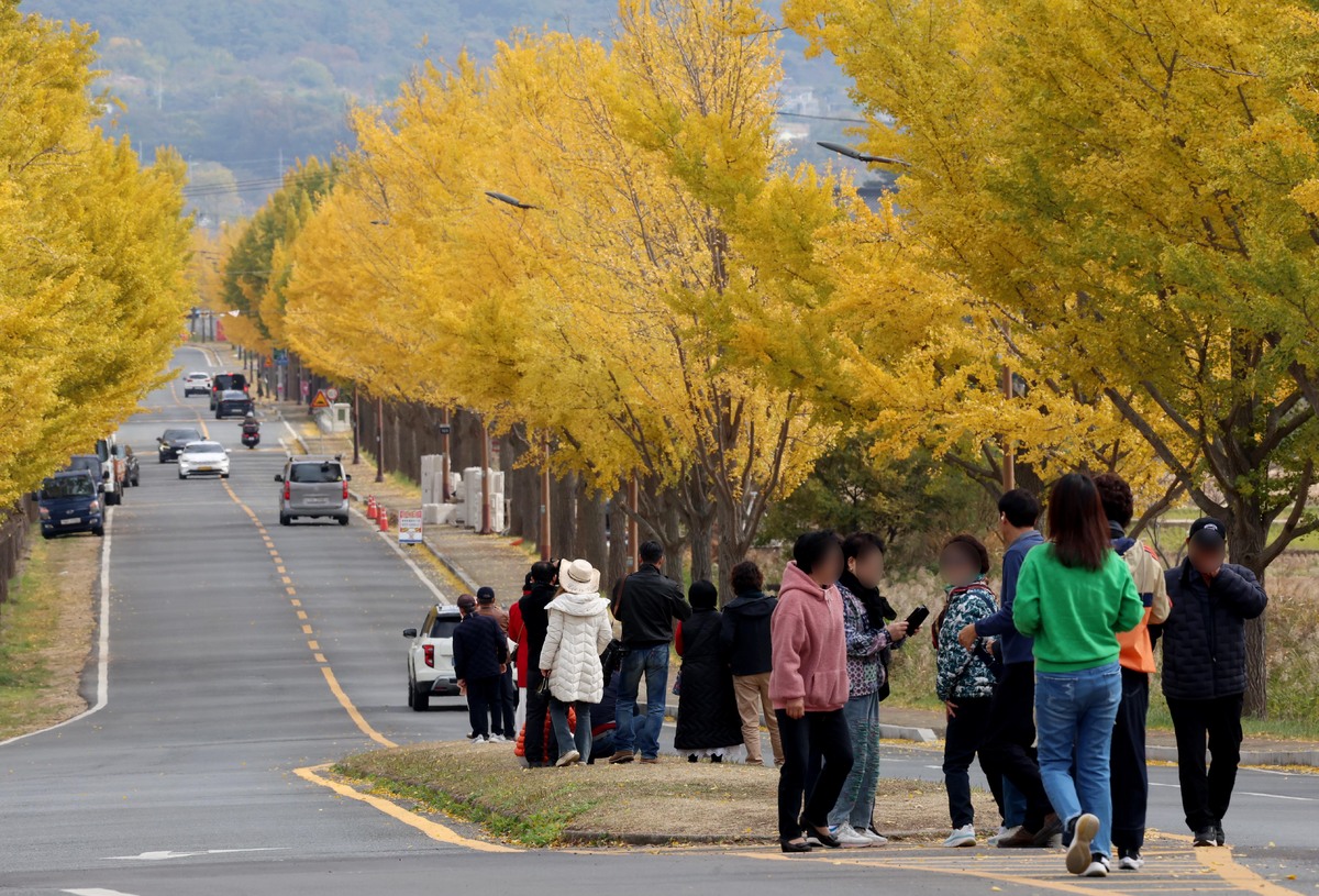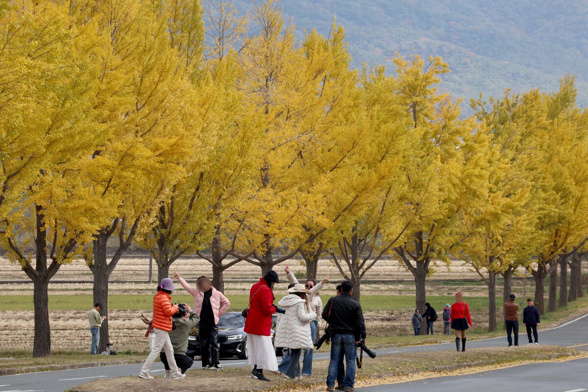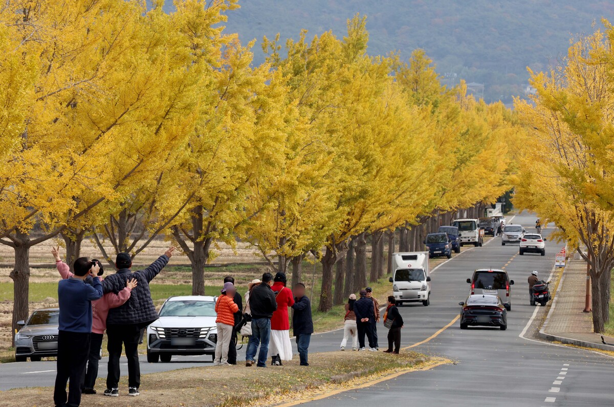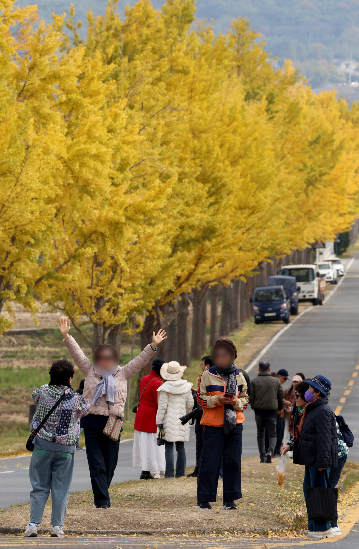 쾌청한 가을 날씨를 보인 16일 경주시 남산동 통일전을 찾은 관광객들이 노란 옷으로 갈아입은 은행나무 아래서 깊어져 가는 가을 정취를 만끽하고 있다. /이용선기자 photokid@kbmaeil.com