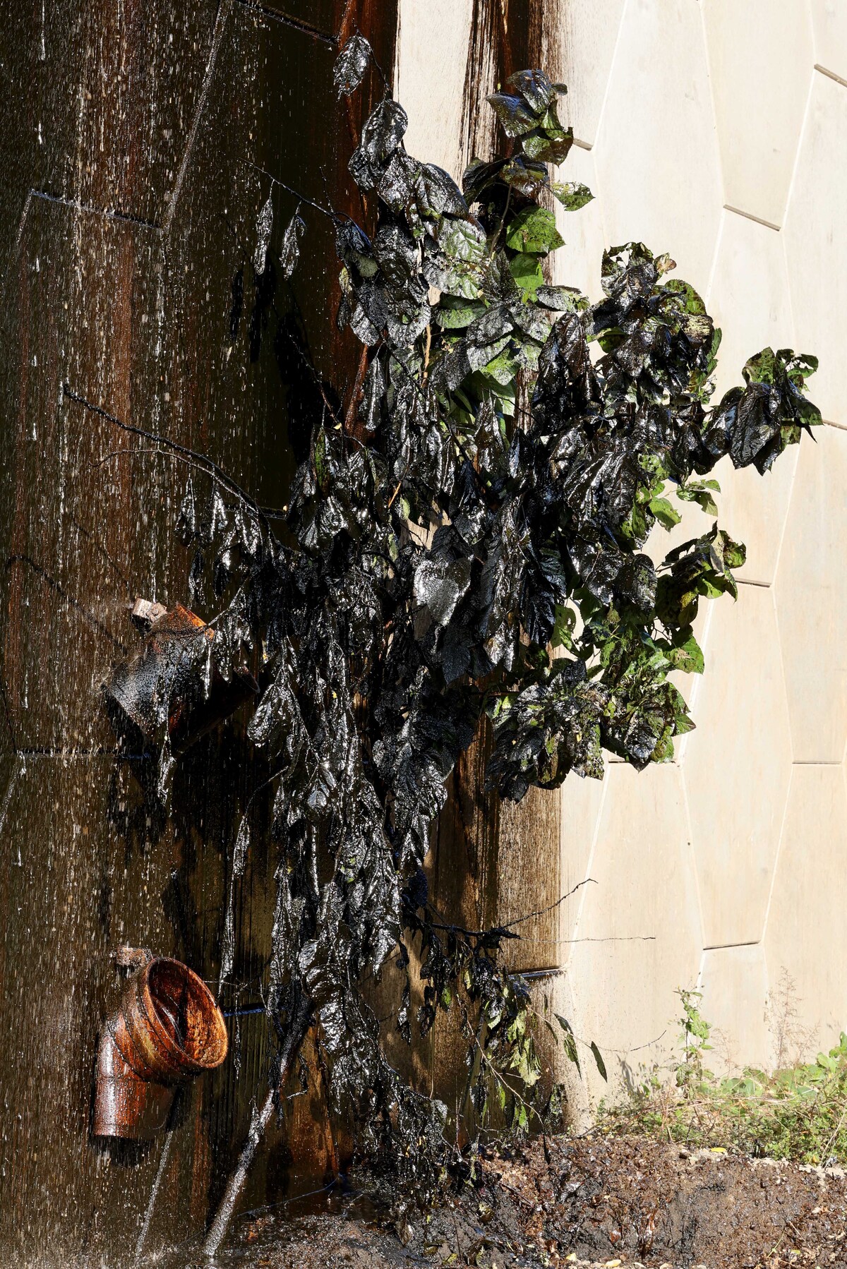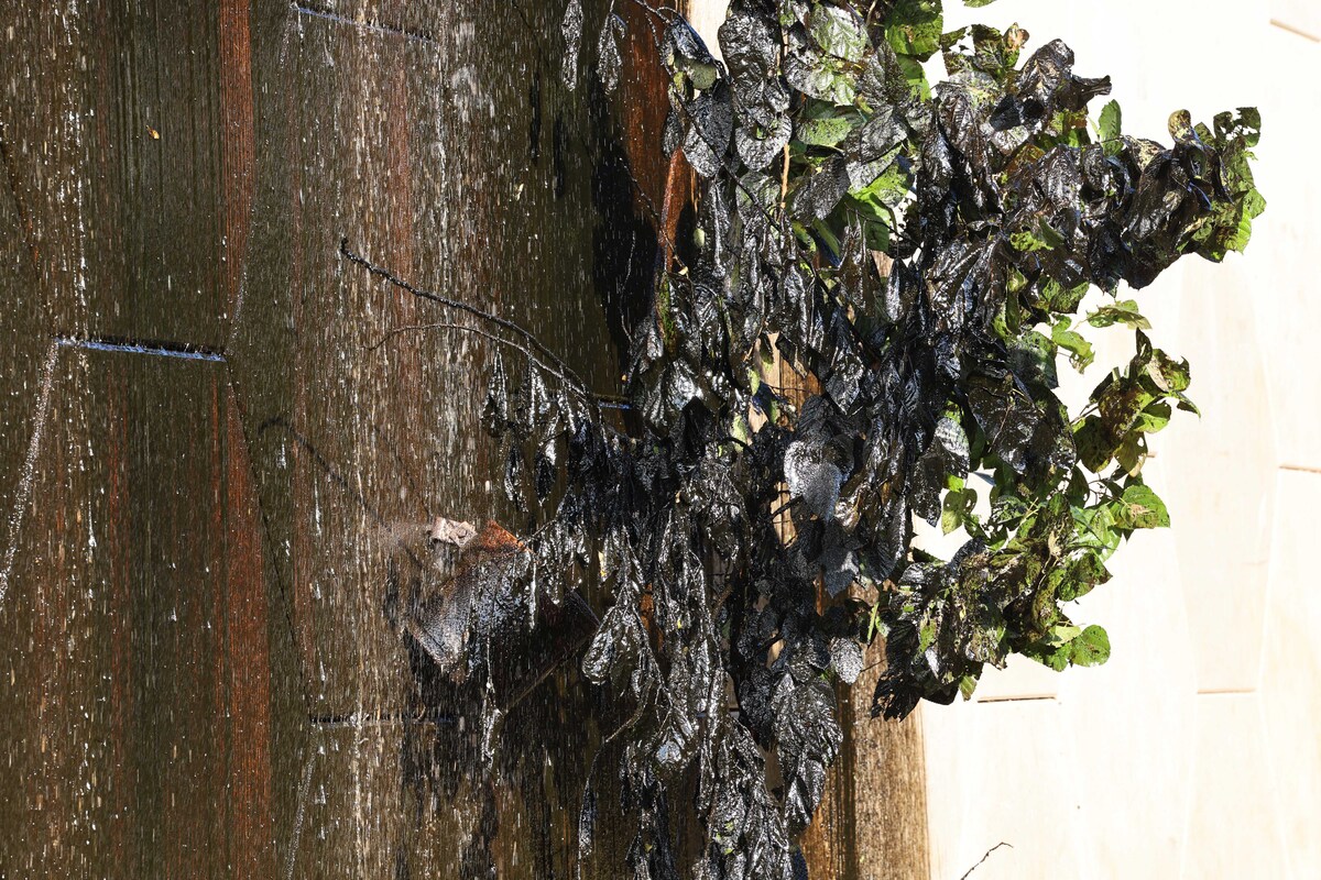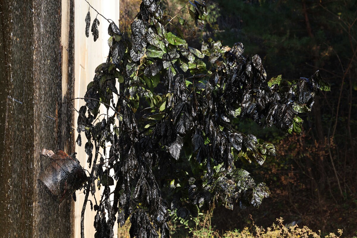 17일 오전 3시 12분께 영천시 신녕면 화남리 상주영천고속도로 신녕IC 인근(63.7㎞ 지점)에서 발생한 대형 사고로 26t 탱크로리 차량(벙커C유 2만4000ℓ 적재)에서 기름이 유출돼 주변을 오염시키고 있다. 사고 현장 교각 아래로 쏟아진 기름으로 나무가 시커멓게 변해있다. /이용선기자photokid@Kbmaeil.com