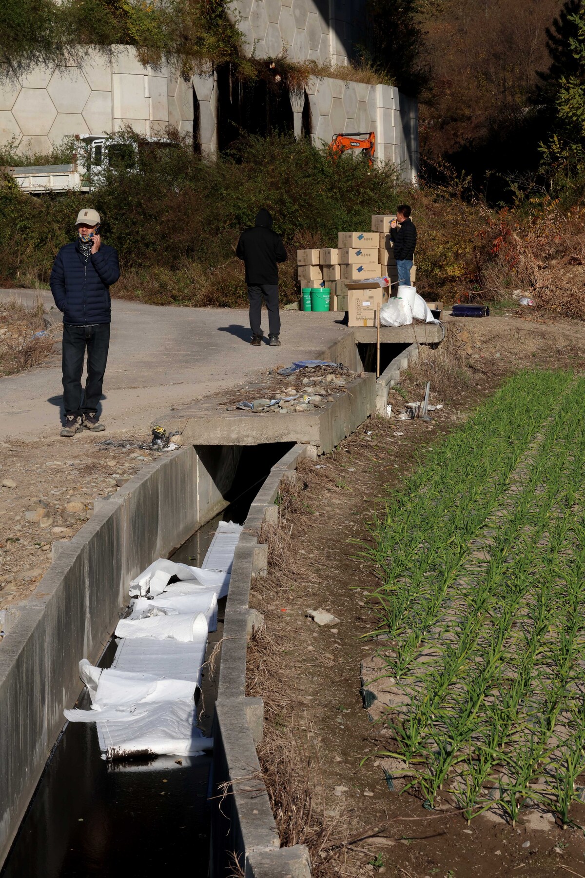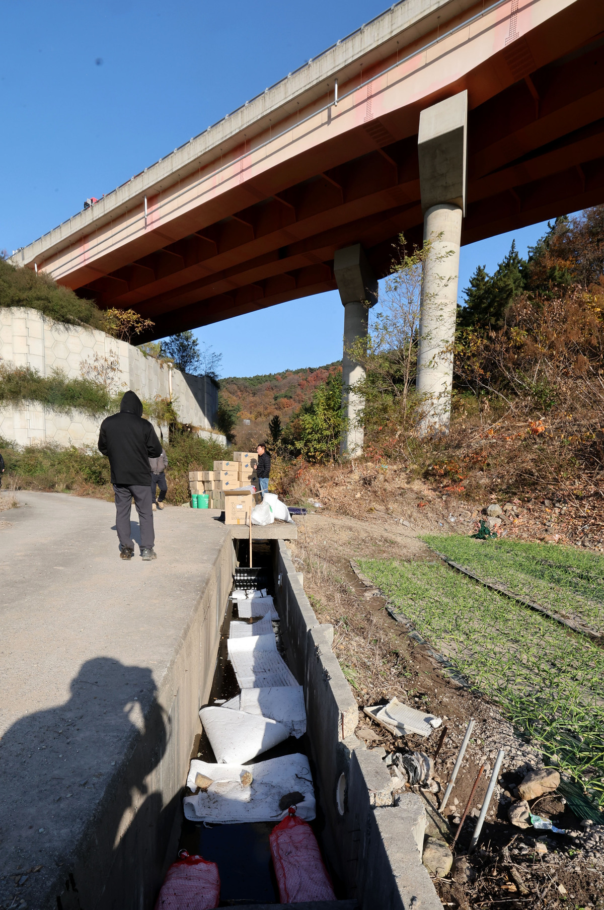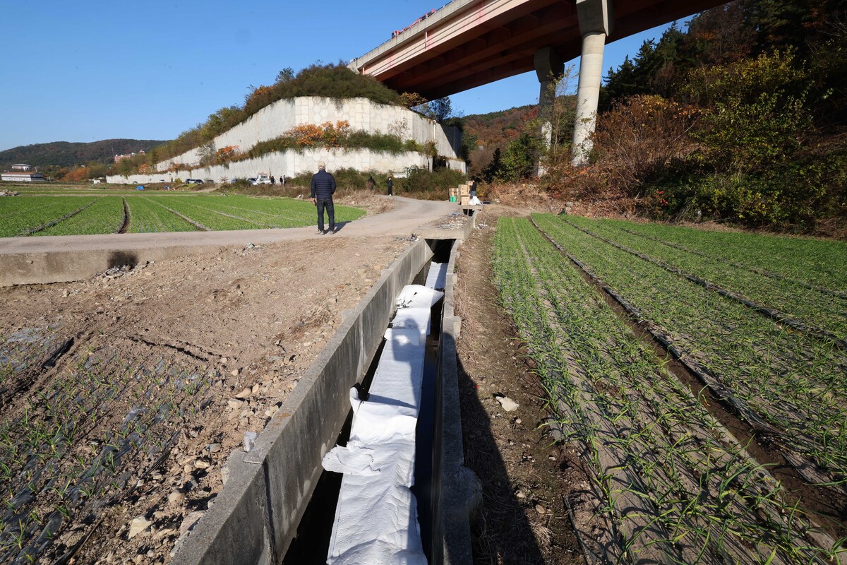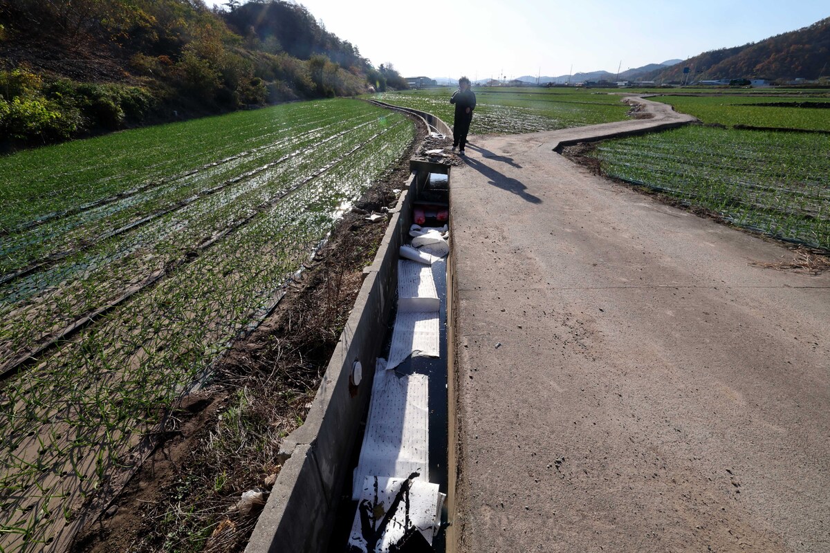 17일 오전 3시 12분께 영천시 신녕면 화남리 상주영천고속도로 신녕IC 인근(63.7㎞ 지점)에서 발생한 대형 사고로 26t 탱크로리 차량(벙커C유 2만4000ℓ 적재)에서 기름이 유출돼 주변을 오염시키고 있다. 사고 현장 교각 아래로 쏟아진 기름이 농수로를 타고 주변 마늘밭 쪽으로 흘러들고 있다. /이용선기자 photokid@Kbmaeil.com