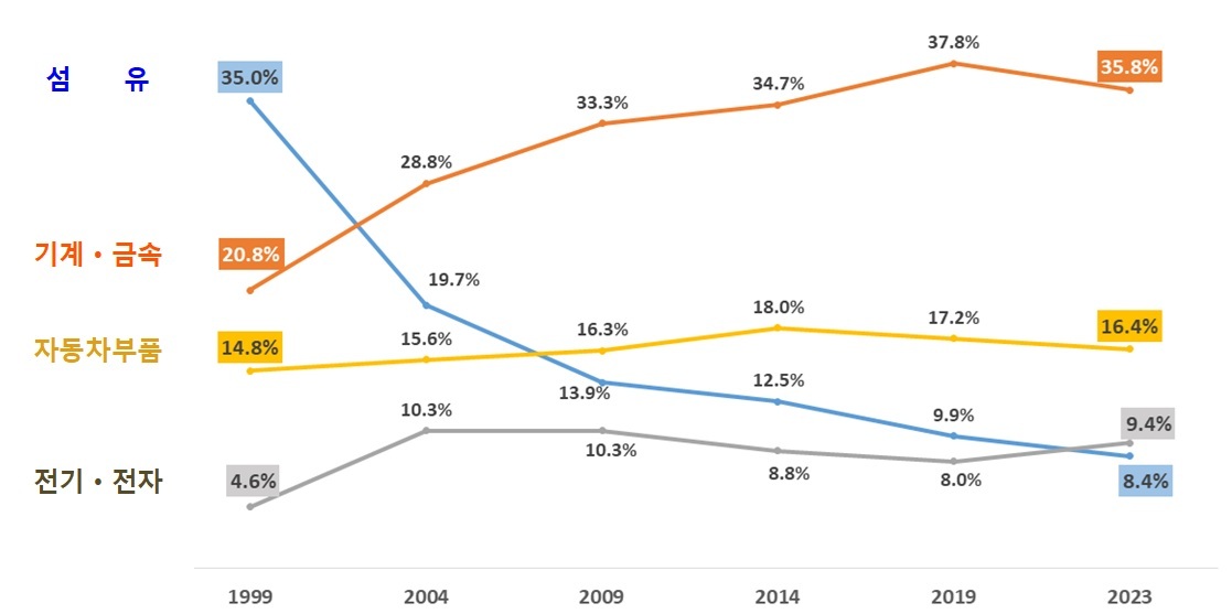 반면, 기계·금속 산업은 같은 기간 20.8%에서 35.8%로 증가하며 지역 제조업 주력 산업으로 자리 잡았다.
