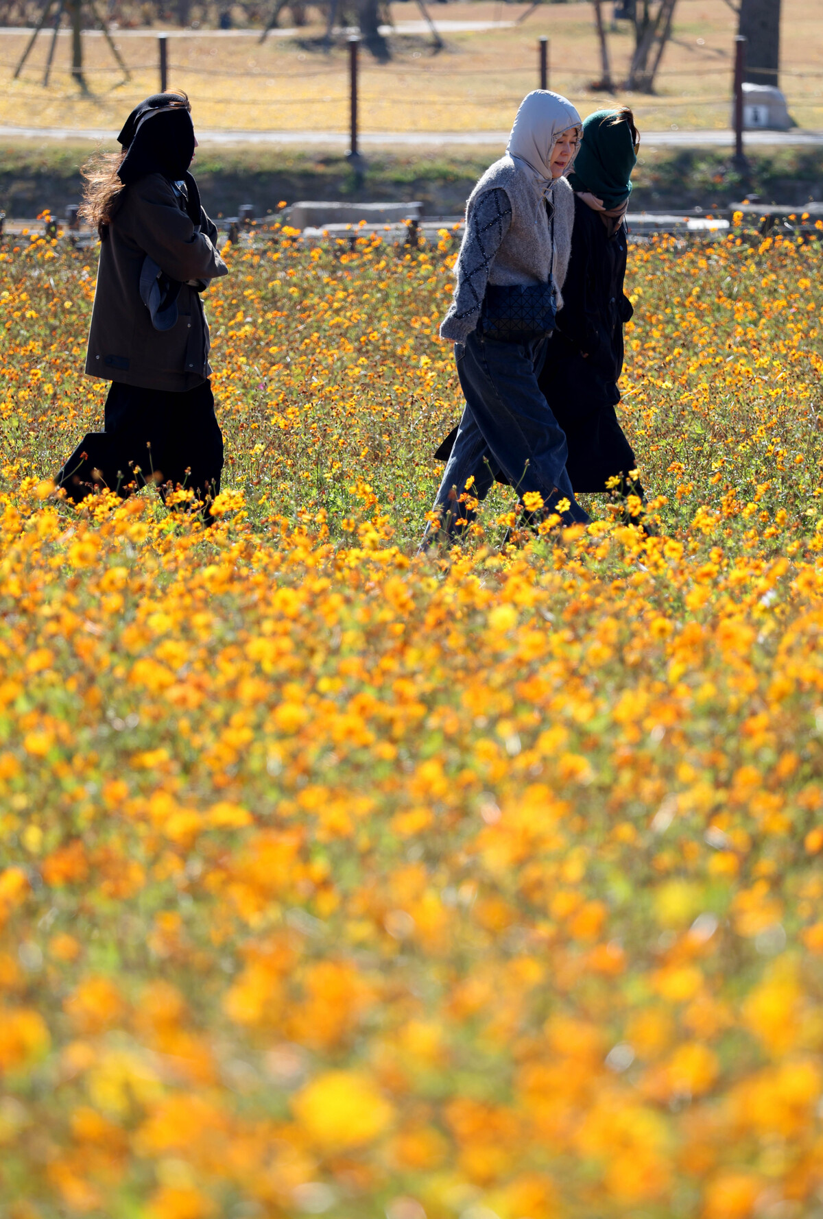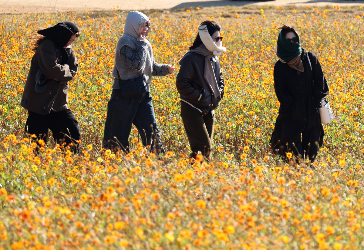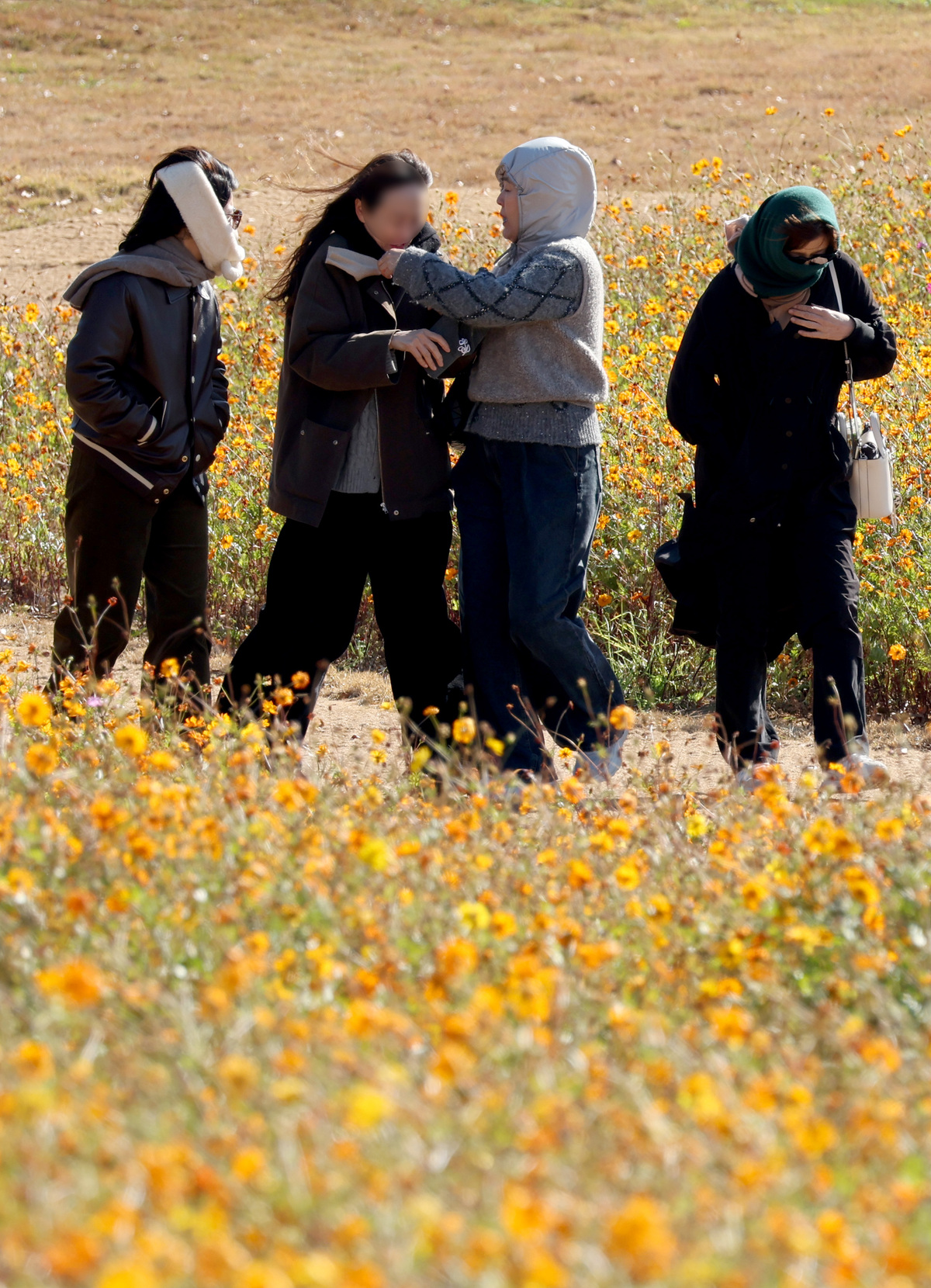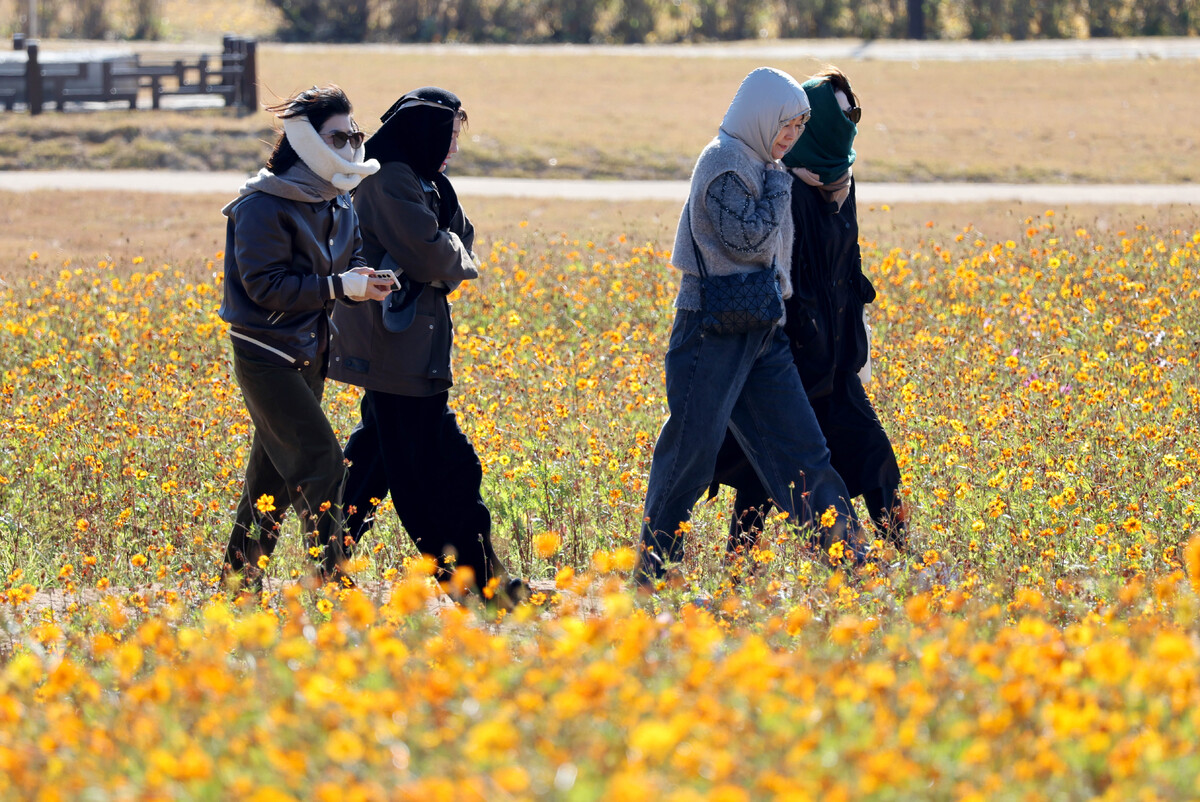경주 지역 아침 최저 기온이 0.8℃를 기록하며 올가을 들어 가장 추운 날씨를 보인 18일 오후 동부사적지 황화 코스모스 군락지를 지나던 관광객들이 찬바람에 옷깃을 여미고 있다. /이용선기자 photokid@kbmaeil.com