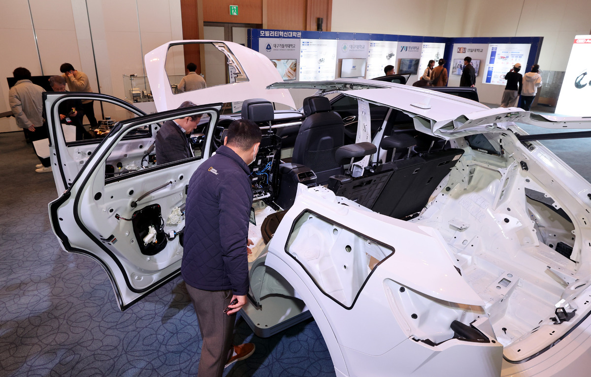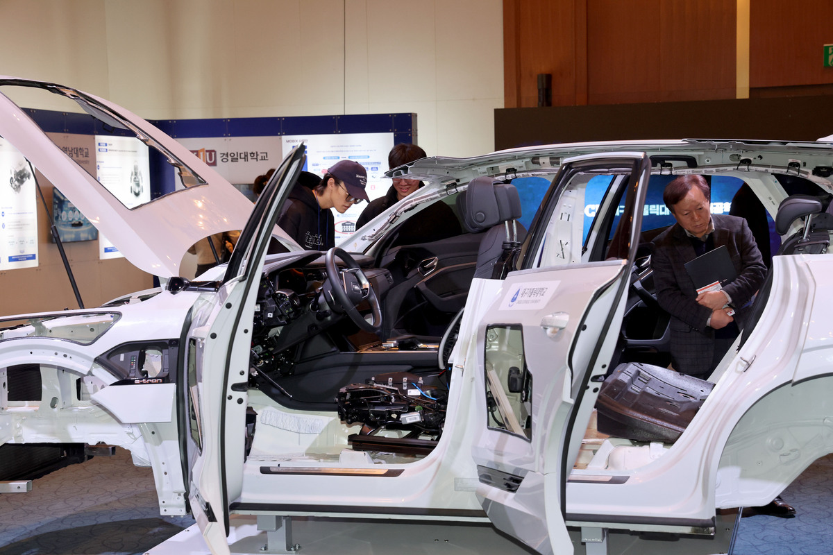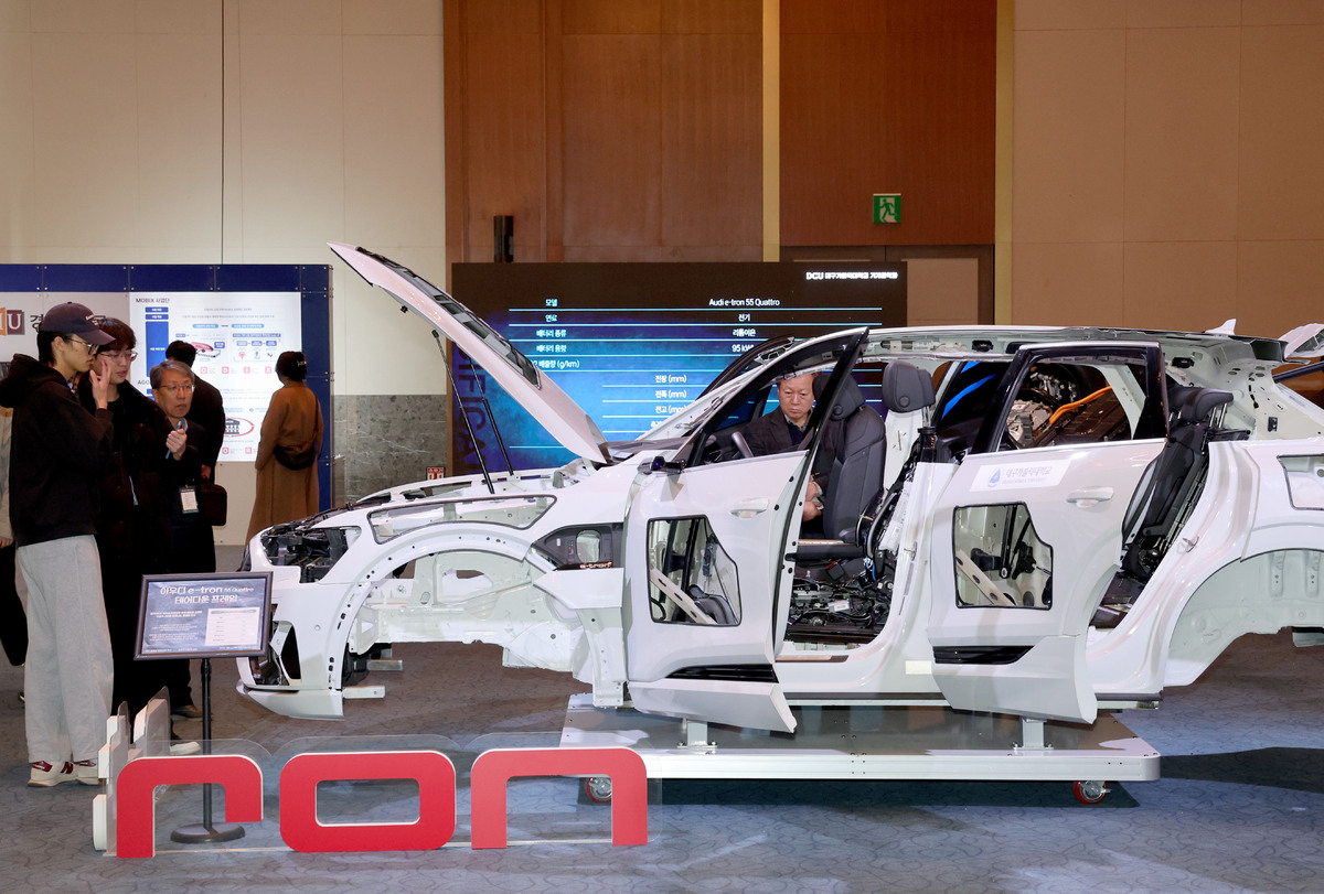 2025 경북 글로벌 미래 모빌리티 포럼이 18일 라한셀렉트 경주에서 열렸다. 행사에 참여한 자동차 산업 관계자들이 전기차 프레임을 살펴보고 있다. /이용선기자 photokid@kbmaeil.com