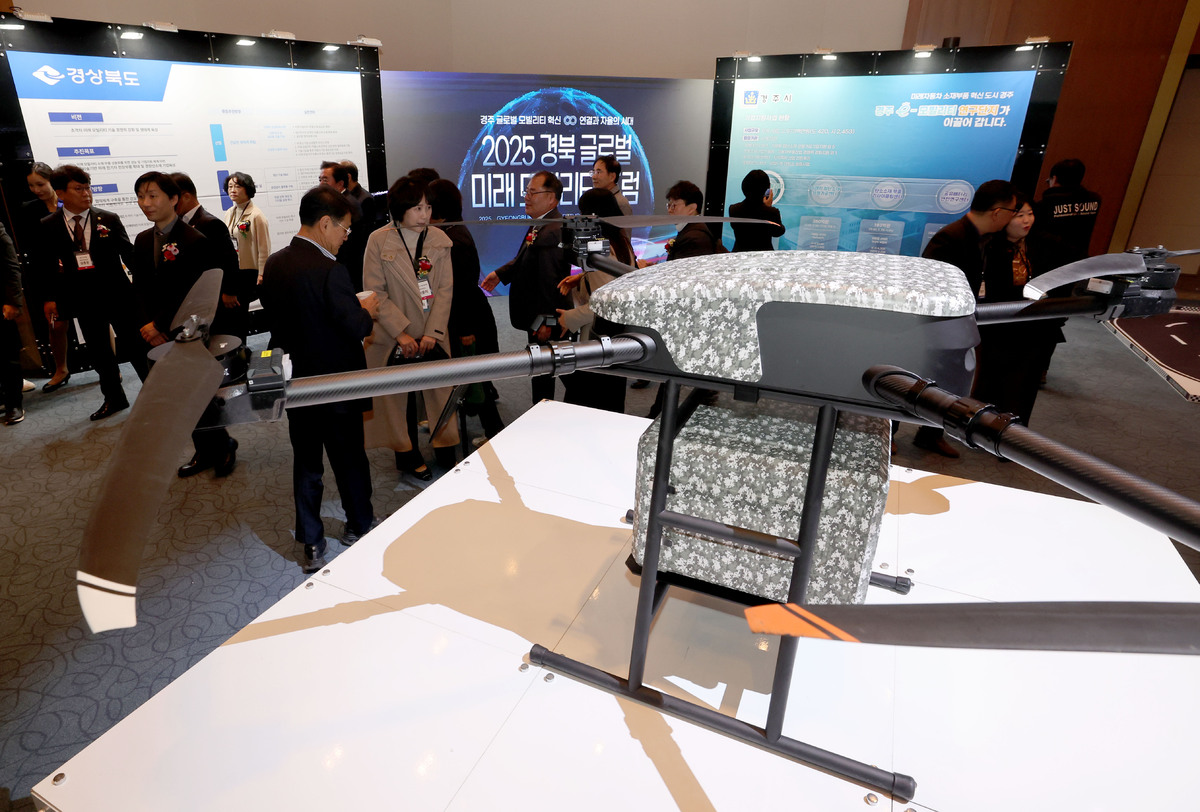 2025 경북 글로벌 미래 모빌리티 포럼이 18일 라한셀렉트 경주에서 열렸다. 행사에 참여한 자동차 산업 관계자들이 군사용 수송 드론을 살펴보고 있다. /이용선기자 photokid@kbmaeil.com