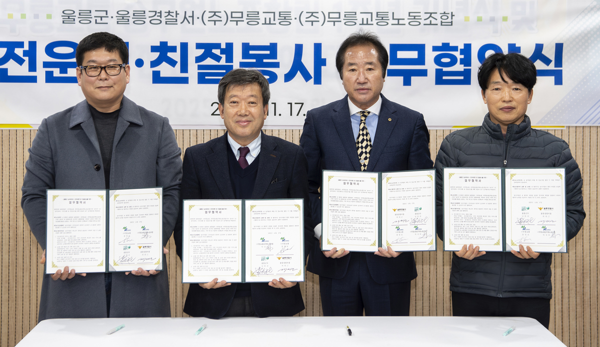 울릉도 농어촌버스(주) 무릉교통승무원 노동조합(위원장 박성하)이 울릉군, 울릉경찰서, ㈜무릉교통과 도동버스정류장에서 안전운전·친절봉사 협약식을 열고, 울릉도 주민과 관광객 모두가 편안하게 이동할 수 있는 교통문화를 함께 만들기로 손을 맞잡았다.