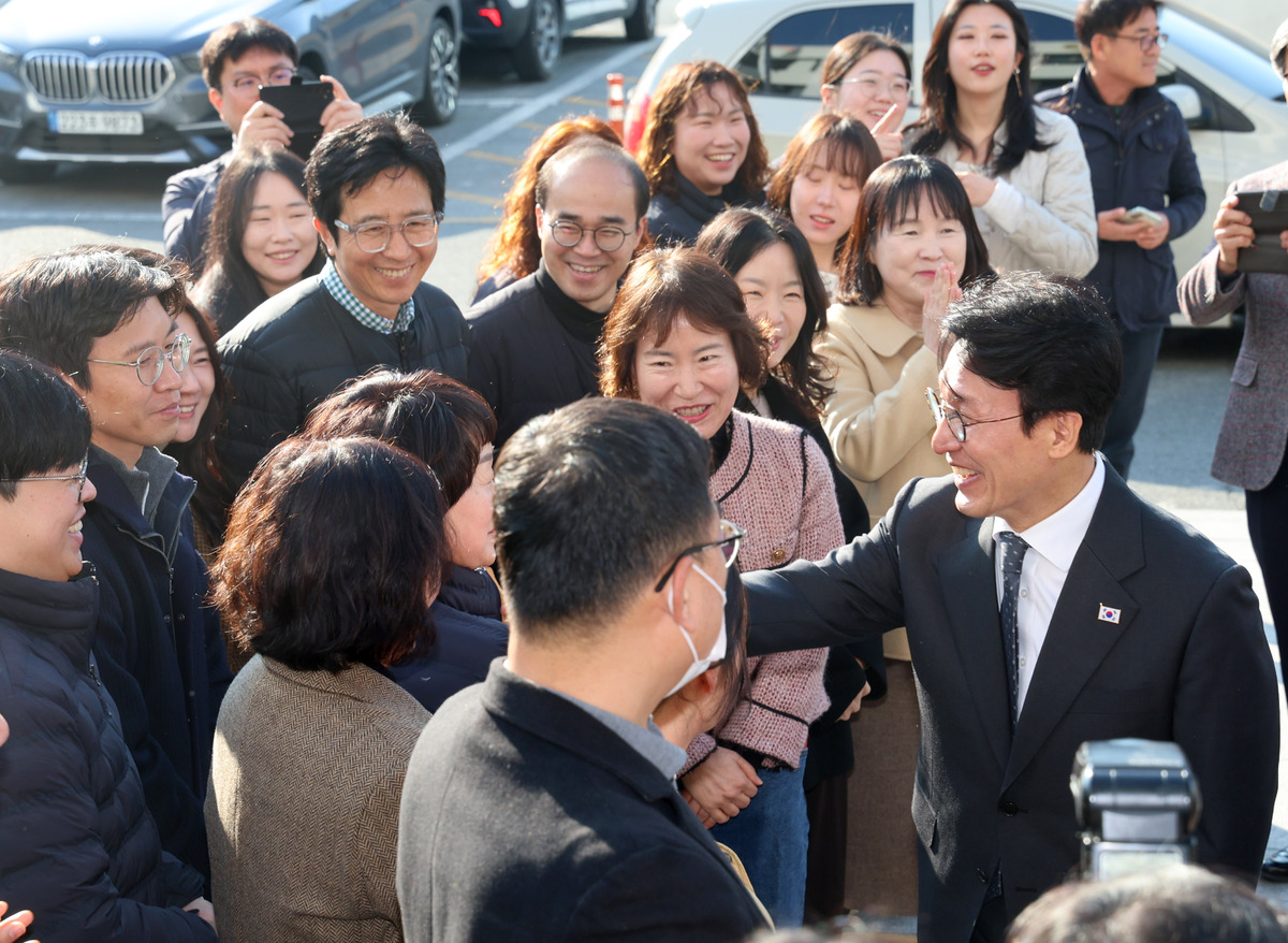 김민석 국무총리가 20일 오전 APEC 정상회의 준비로 고생한 경주시 공무원을 격려하려고 경주시청을 방문했다. 김 총리 방문을 환영하는 직원들과 악수하고 있다. /이용선기자 photokdi@kbmaeil.com