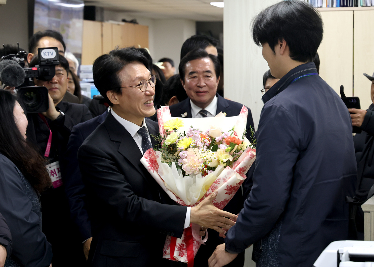 김민석 국무총리가 20일 오전 APEC 정상회의 준비로 고생한 경주시 공무원을 격려하려고 경주시청을 방문했다. 도로과 사무실에서 직원이 환영 꽃다발을 전달하고 있다. /이용선기자 photokdi@kbmaeil.com