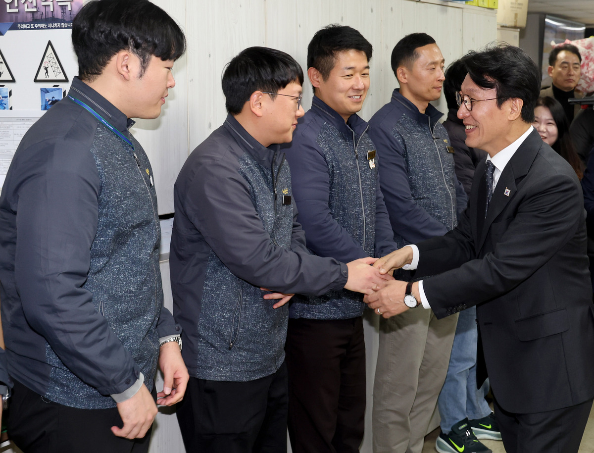 김민석 국무총리가 20일 오전 APEC 정상회의 준비로 고생한 경주시 공무원을 격려하려고 경주시청을 방문했다. 도로과 사무실에서 직원들과 악수하고 있다. /이용선기자 photokdi@kbmaeil.com