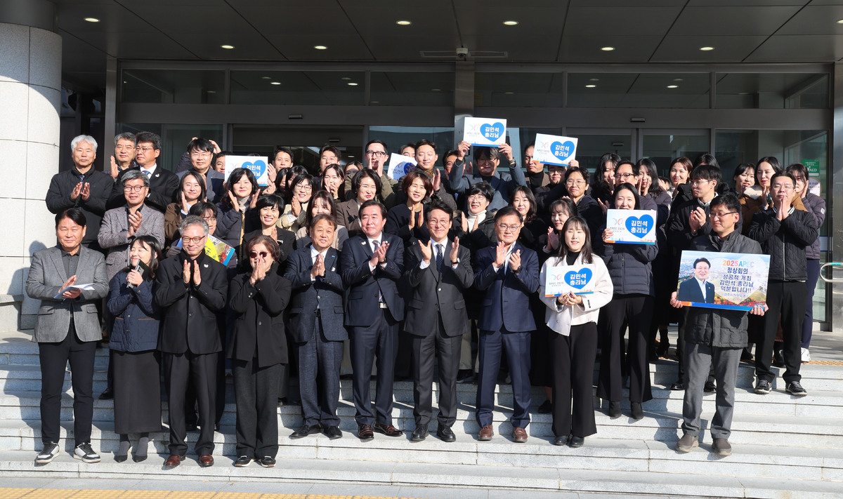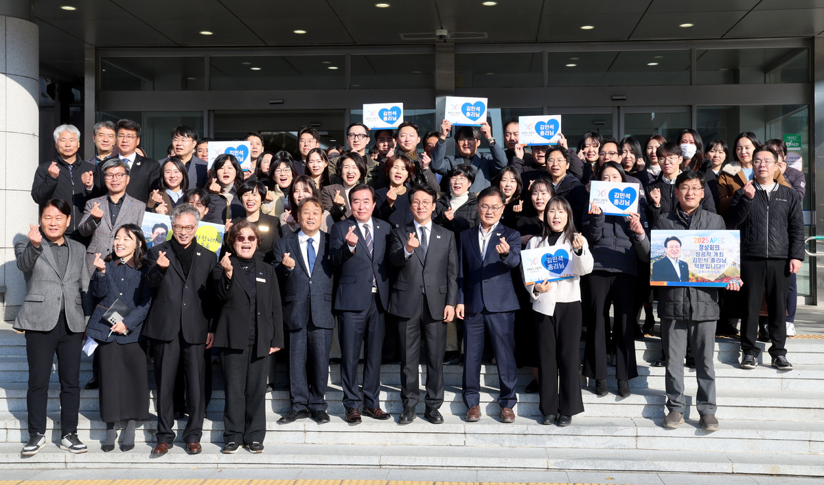 김민석 국무총리가 20일 오전 APEC 정상회의 준비로 고생한 경주시 공무원을 격려하려고 경주시청을 방문했다. 시청 현관 앞에서 김 총리의 선창으로 “경주시민 여러분 사랑합니다.”라며 직원들과 기념 촬영을 하고 있다. /이용선기자 photokdi@kbmaeil.com