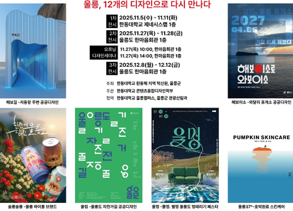 울릉군 한마음회관 전시는 27일부터 28일까지 1차로 진행되고 12월 8일부터 12일까지 2차 전시가 열린다. 특히 전시 첫날인 27일에는 오프닝 행사와 디자인 세미나가 함께 열려 학생들의 성과를 주민과 관계자들이 직접 보고 의견을 나누는 소통의 장도 마련된다.