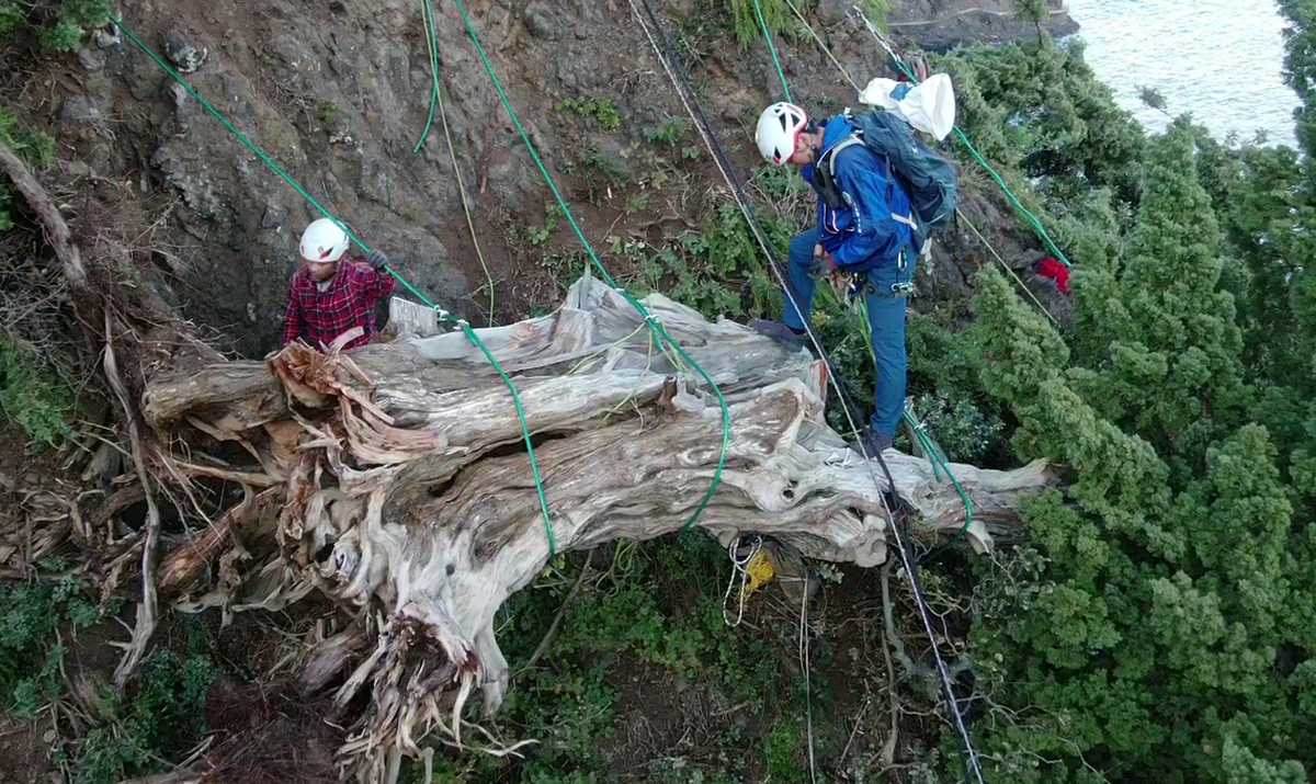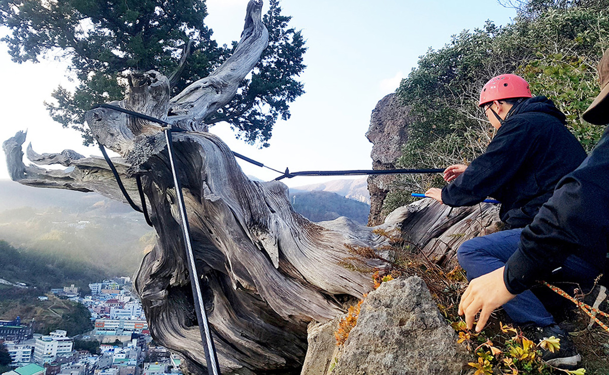 울릉산악회는 울릉산악구조대원을 포함한 경험 많은 회원들이 활동하고 있다. 이날 10여 명의 회원들은 전문가들과 함께 오전 9시30분 울릉군청을 출발해 해발 140m 절벽에 자생하는 최고 수령 향나무를 향해 보조로프를 이용해 접근했다.