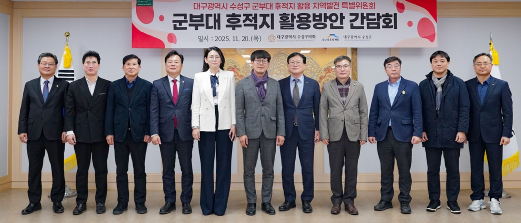 대구 수성구의회 ‘군부대 후적지 활용 지역발전 특별위원회’(위원장 남정호, 부위원장 김중군)는 지난 20일 수성구청에서 구청과 함께 ‘군부대 후적지 활용방안 간담회’를 개최했다. 이번 회의는 지난 7월 열린 1차 간담회의 후속 논의로, 특별위원 6명과 김대권 수성구청장, 관련 부서 국·과장, 용역사 등 11명이 참석했다.