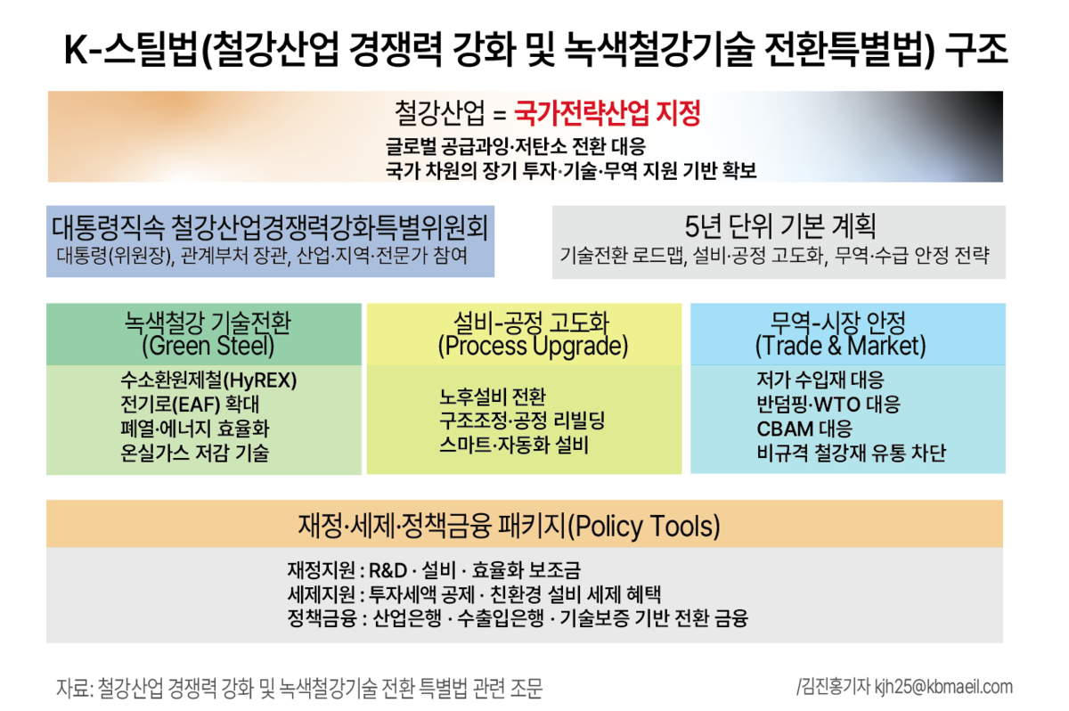 K-스틸법은 △철강산업의 국가전략산업 지정 △대통령을 위원장으로 하는 ‘철강산업경쟁력강화특별위원회’ 설치 △5년 단위 기본계획 수립 △녹색철강·저탄소 기술 전환 지원 △불공정 무역 대응 강화 등이 골자이다.
