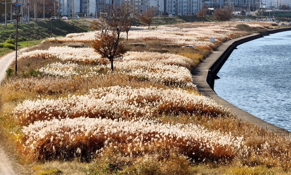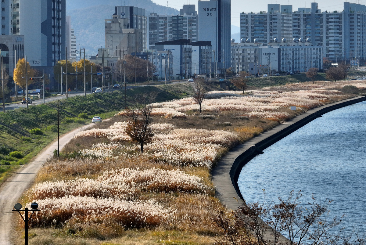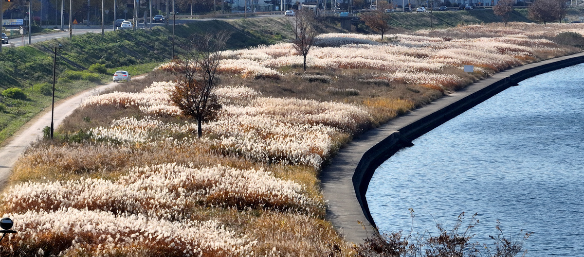 포항 지역 낮 최고 기온이 19.8℃를 기록하며 포근한 늦가을 날씨를 보인 24일 오후 햇살을 받은 남구 연일읍 형산강 변 갈대가 은빛으로 일렁이고 있다. /이용선기자 photokid@kbaeil.com